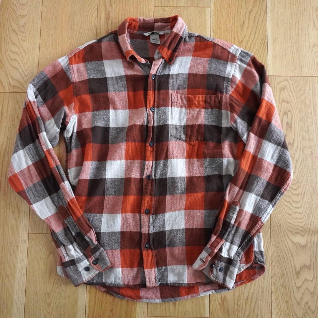 オレンジ チェック柄 ネルシャツ 秋冬 カジュアル M