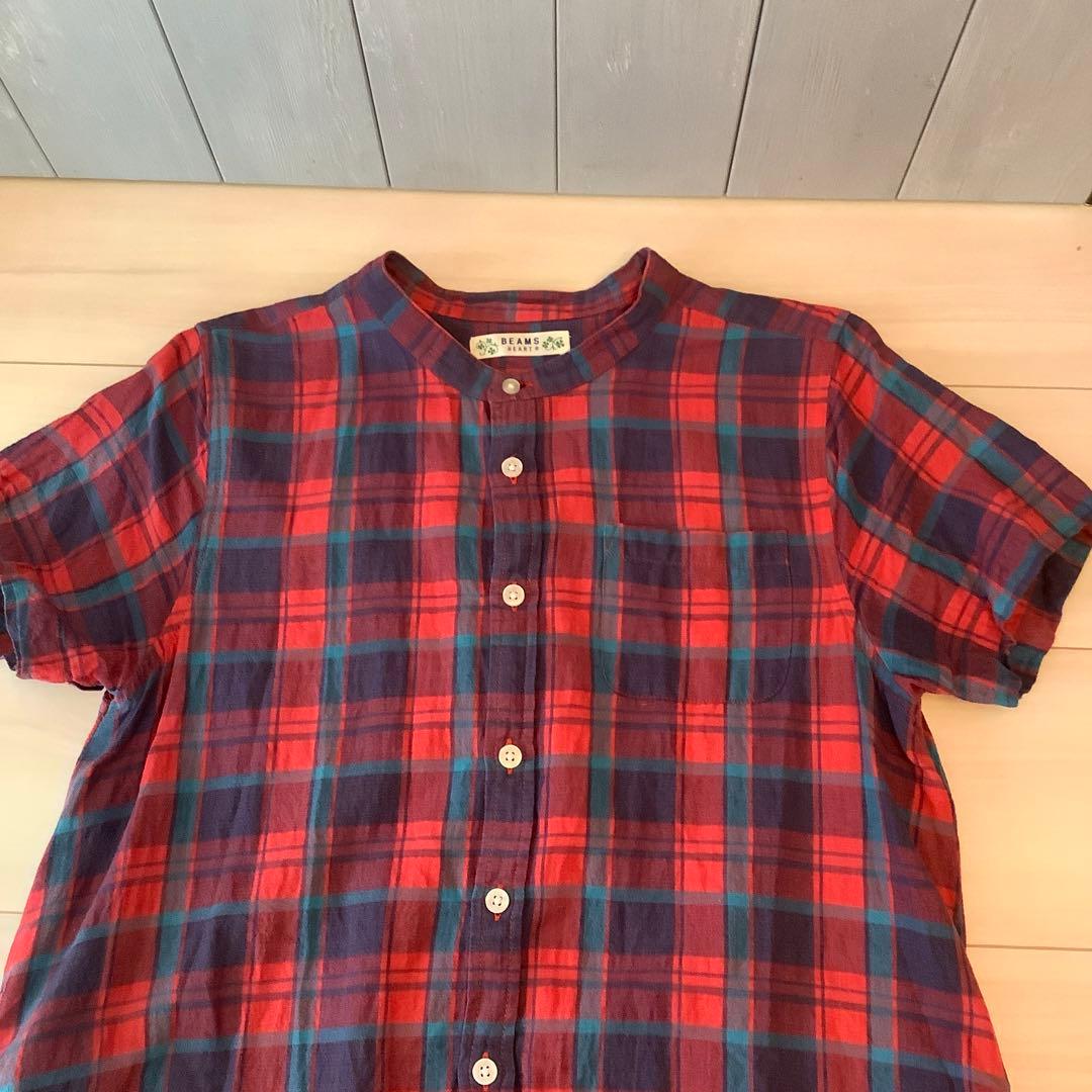 BEAMS HEARTのレッド・ネイビー・グリーンのチェック柄半袖シャツワンピース。