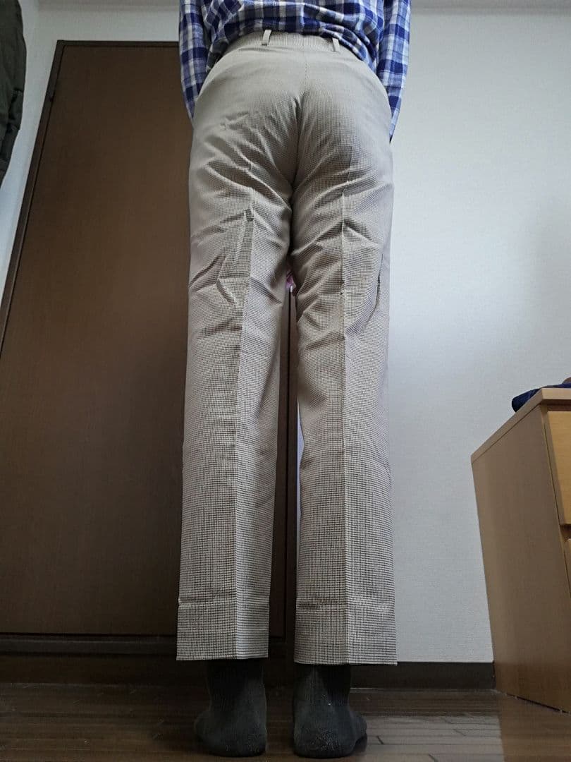 股下71cmという数字になりましたが、一方で、股上がかなり深いつくりになっています。画像の着用者は176cm63kgのやや痩せ型ですが、ウエストが少しきつく感じ、画像の通りやや丈が短めですので、私より少し小柄の方向けかなという感じがします。