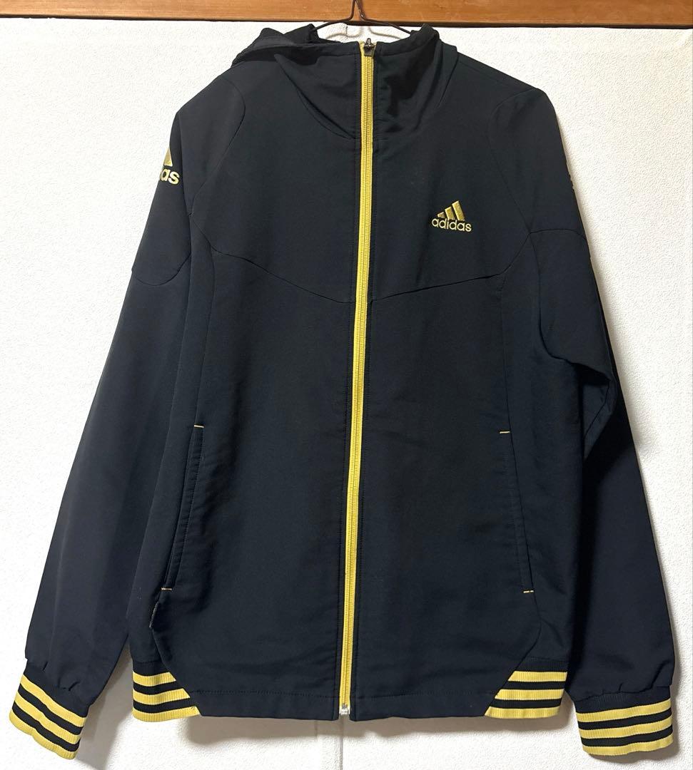 フード付きのネイビーとイエローのadidasジャケット、刺繍ロゴ付き。 - ブランド: adidas - スタイル: ジャケット - ロゴ: 刺繍ロゴ - デザイン: フード付き ご覧いただきありがとうございます。