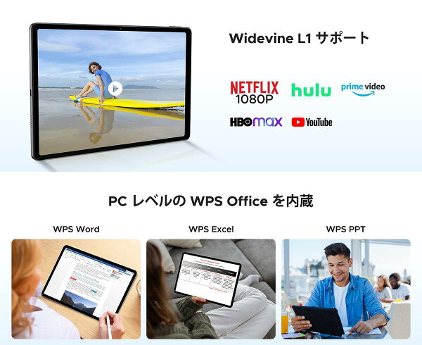 11インチの大画面と高精細HD IPSパネル、さらに90Hzのなめらかリフレッシュレートを採用し、映像コンテンツやゲーム、電子書籍の閲覧も臨場感たっぷり。Widevine L1対応によりNetflixやAmazon Prime、YouTubeで1080P高画質ストリーミングを堪能できます。家族とのシェア視聴にも最適な広視野角で、映画鑑賞やオンライン授業、SNSチェック、ウェブ閲覧まで楽しめる高性能Androidタブレットです。
