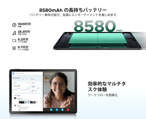 パワフルな8580mAhバッテリーを搭載し、動画再生、Zoom会議、Web授業、電子書籍の読書、音楽鑑賞などを長時間快適に利用可能。最新Android 16の省電力最適化と組み合わせ、モバイルワークにも安心のスタミナ性能を発揮。外出先でもType-C急速充電に対応しており、出張や旅行時の心強い相棒となります。