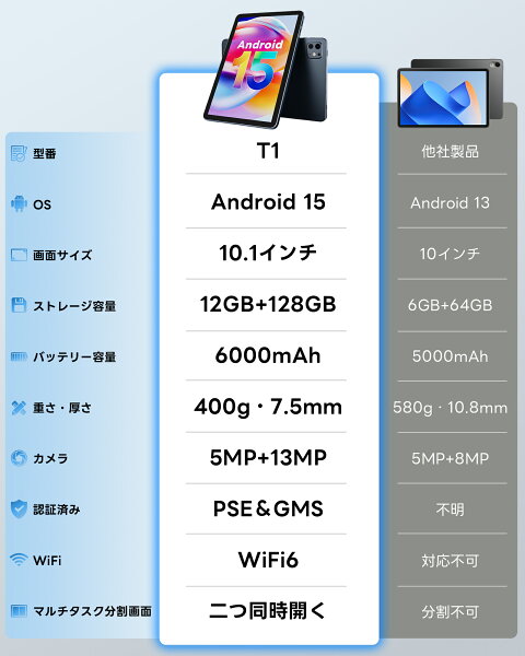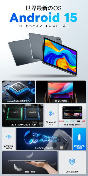 楽天6冠達成★\79%OFF&P2倍ポイント→12,461円/タブレット Android15 12GB+128GB+1TB-TF拡張 10.1インチ Wi-Fiモデル 8コアCPU アンドロイド15 Bluetooth5.4 6000mAhバッテリー デュアルカメラ 軽量薄型 WidevineL1対応 電子書籍/動画視聴/仕事/学習/子供用