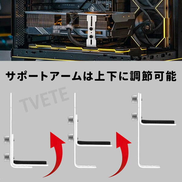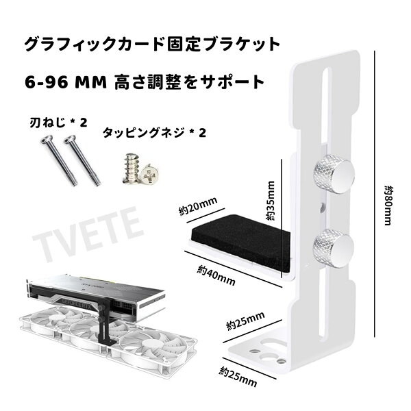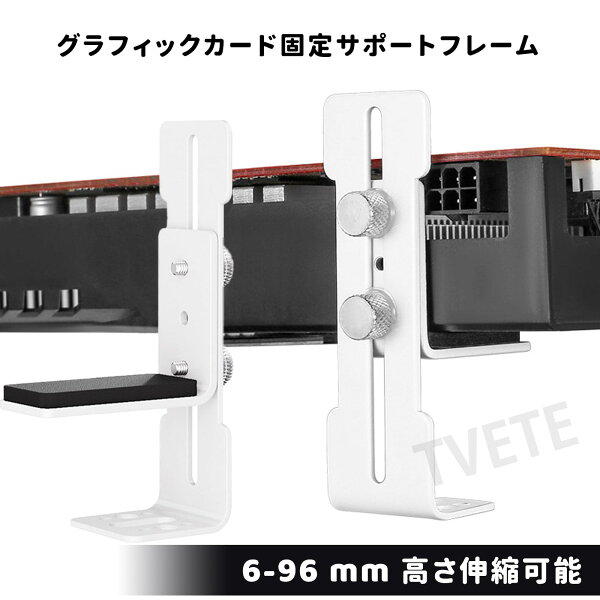 # 【送料無料】TVETE グラフィックボード 支え グラボ支え ビデオカードホルダー 垂直ブラケット メタル 金属 調整可能 6-96mm ラフィックボード ブラケット ホルダー GPU サポート ファンに取り付け ネジ付け (ホワイト)パソコンのパーツの中でも、グラフィックボードは特に重く、使い方によっては自重でたわむことがあります。これにより、パフォーマンスが低下したり、最悪の場合、故障の原因にもなります。しかし、そんな悩みを解決できるのが「TVETE グラフィックボード支え」です。