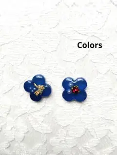 No329 レジンピアスイヤリング 花 クローバー 青 ブルー 金箔 ビジュー