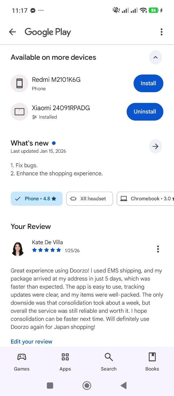 Great experience using Doorzo! I used EMS shipping, and my package arrived at my address in just 5 days, which was faster than expected. The app is easy to use, tracking updates were clear, and my items were well-packed. The only downside was that consolidation took about a week, but overall the service was still reliable and worth it. I hope consolidation can be faster next time. Will definitely use Doorzo again for Japan shopping!