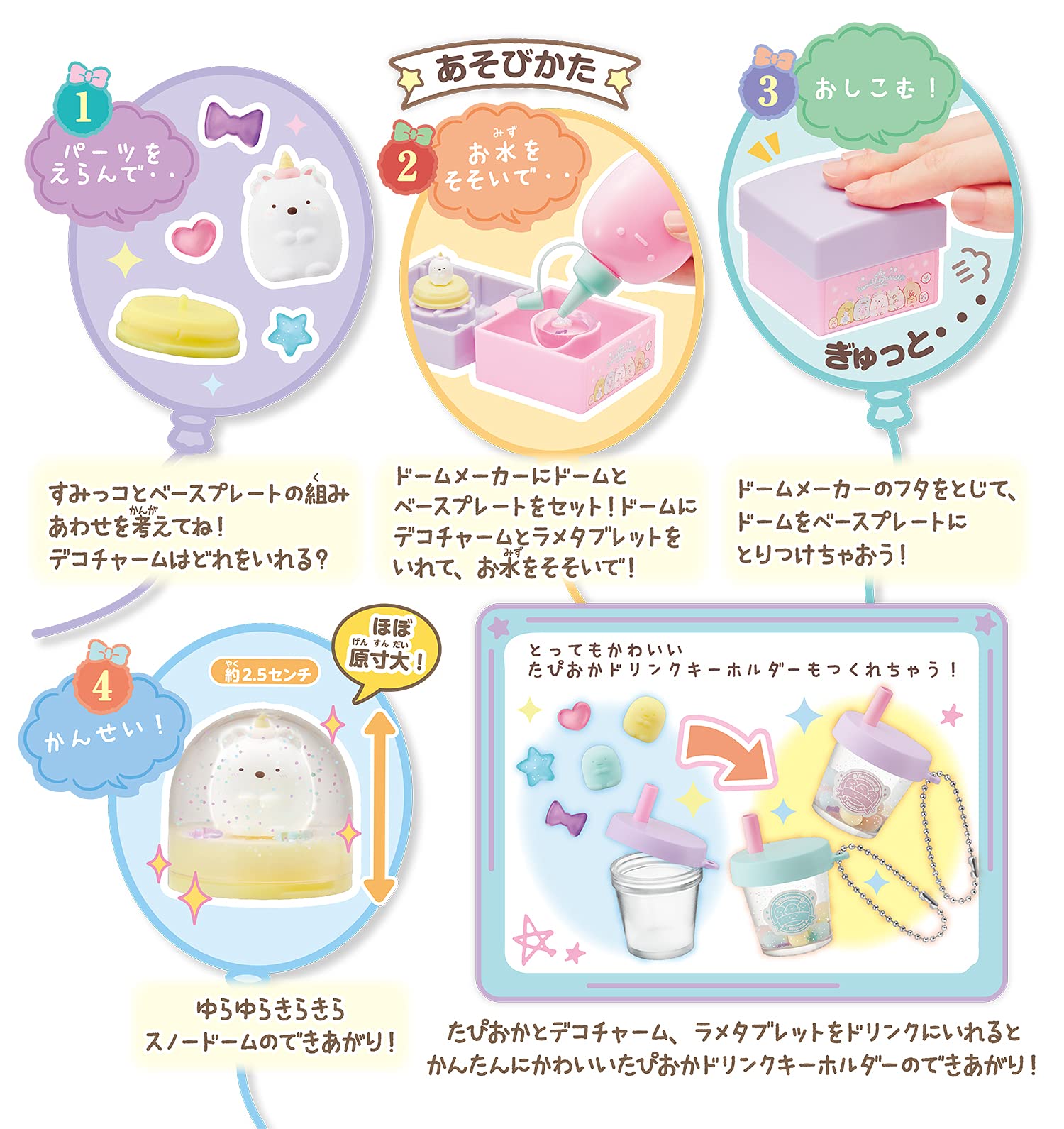 | 同梱商品: | シールシート、ラメタブレット、取扱説明書×1, ディスプレイ×3(ユニコーン、コーヒーカップ×2)、水ボトル×1、ゆびわ×1, ドームメーカー×1、人形×6、たぴおか人形×20(黄色・ピンク・ブルー・ブラック/各5), ブレスレット×1、ネックレス×1、ドーム×6、ベースプレート×6(紫・ピンク・黄色/各2), ボールチェーン×2、ドリンク(容器・フタ)×2、デコチャーム×24(ハート・星・リボン/各8) |