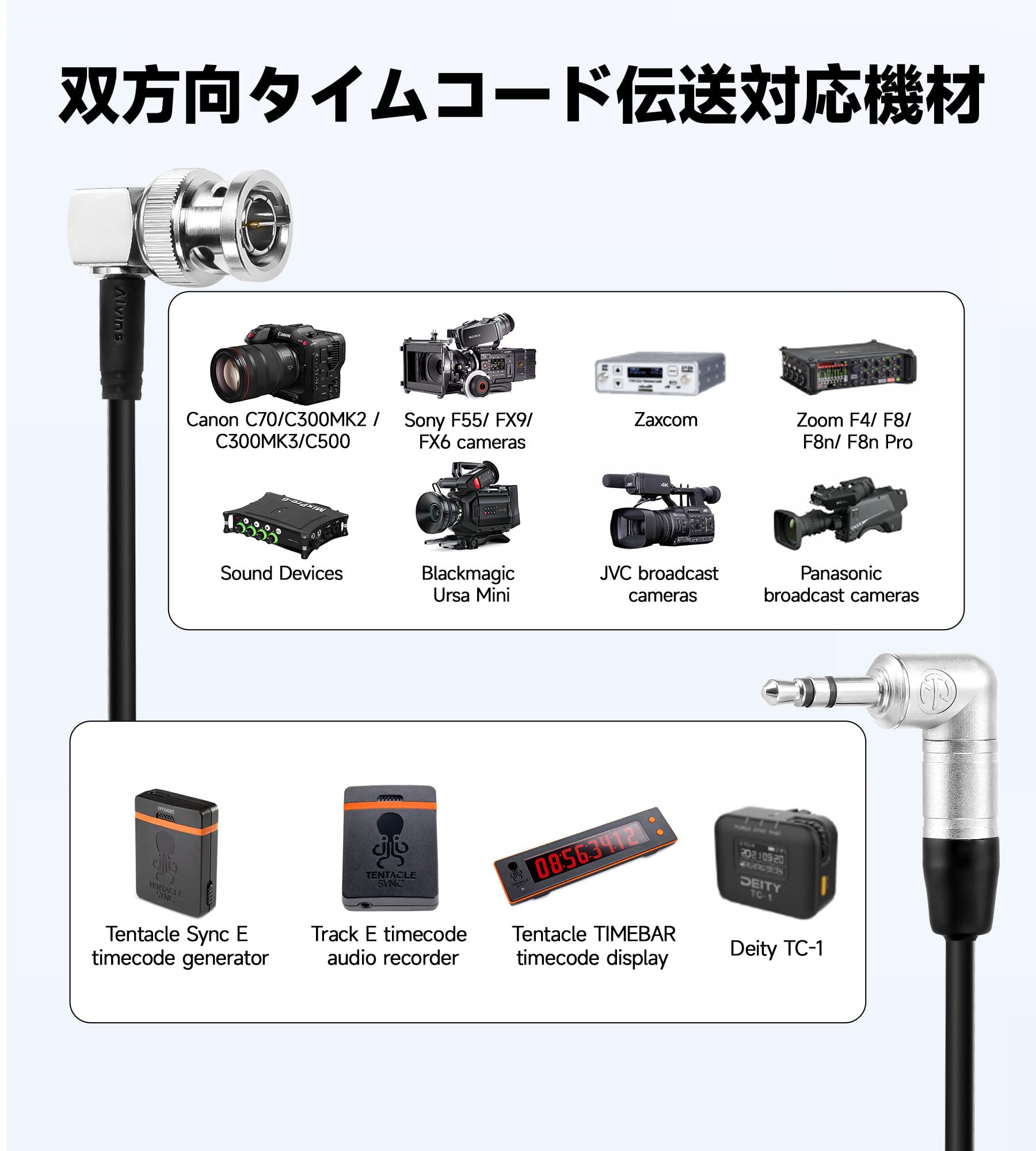 | 対応機種: | Canon C70、C300 MK II、C300 MK III、C500、Sony F55、FX9、FX6、Zaxcom、Zoom F4、F8、F8n、F8n Pro、サウンドデバイス、Blackmagic Ursa Mini、JVC放送カメラ、パナソニック放送カメラ。 |
