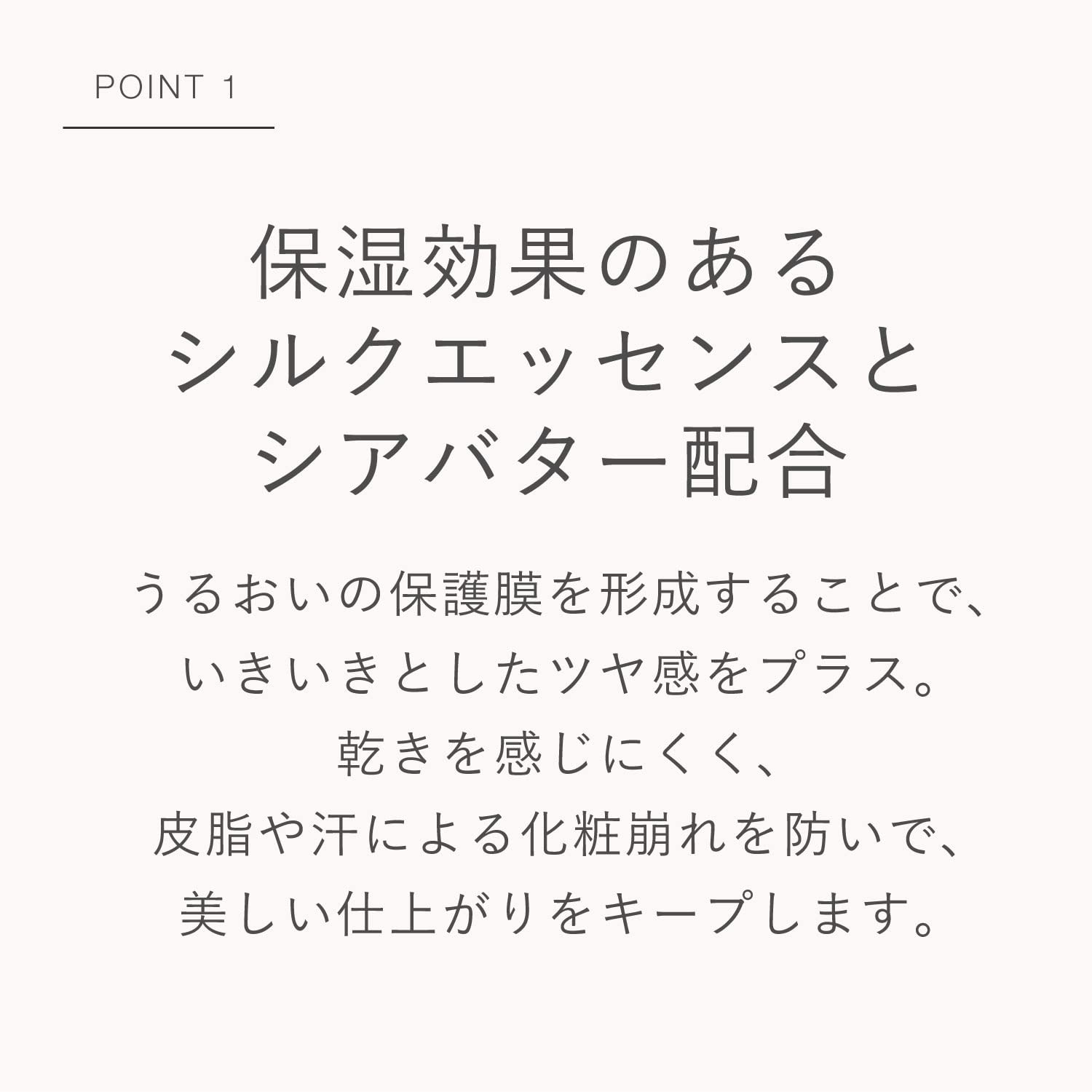 | 商品の利点: | 保湿効果のあるシルクエッセンスとシアバター配合。うるおいの保護膜を形成することで、いきいきとしたツヤ感をプラス。乾きを感じにくく、皮脂や汗による化粧崩れを防いで、美しい仕上がりをキープします。 |