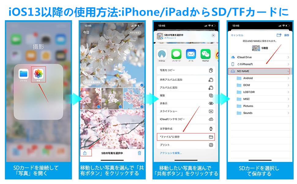 5.双方向転送:iOS/iPadOS 13以上の場合、USBメモリーからiPhone/iPadへのデータ転送、iPhone/iPadからUSBメモリーへのデータ転送に対応しています。【iPadOS8.0〜iOS12はUSBメモリーからiPhone/iPadへのデータ転送のみ対応】
