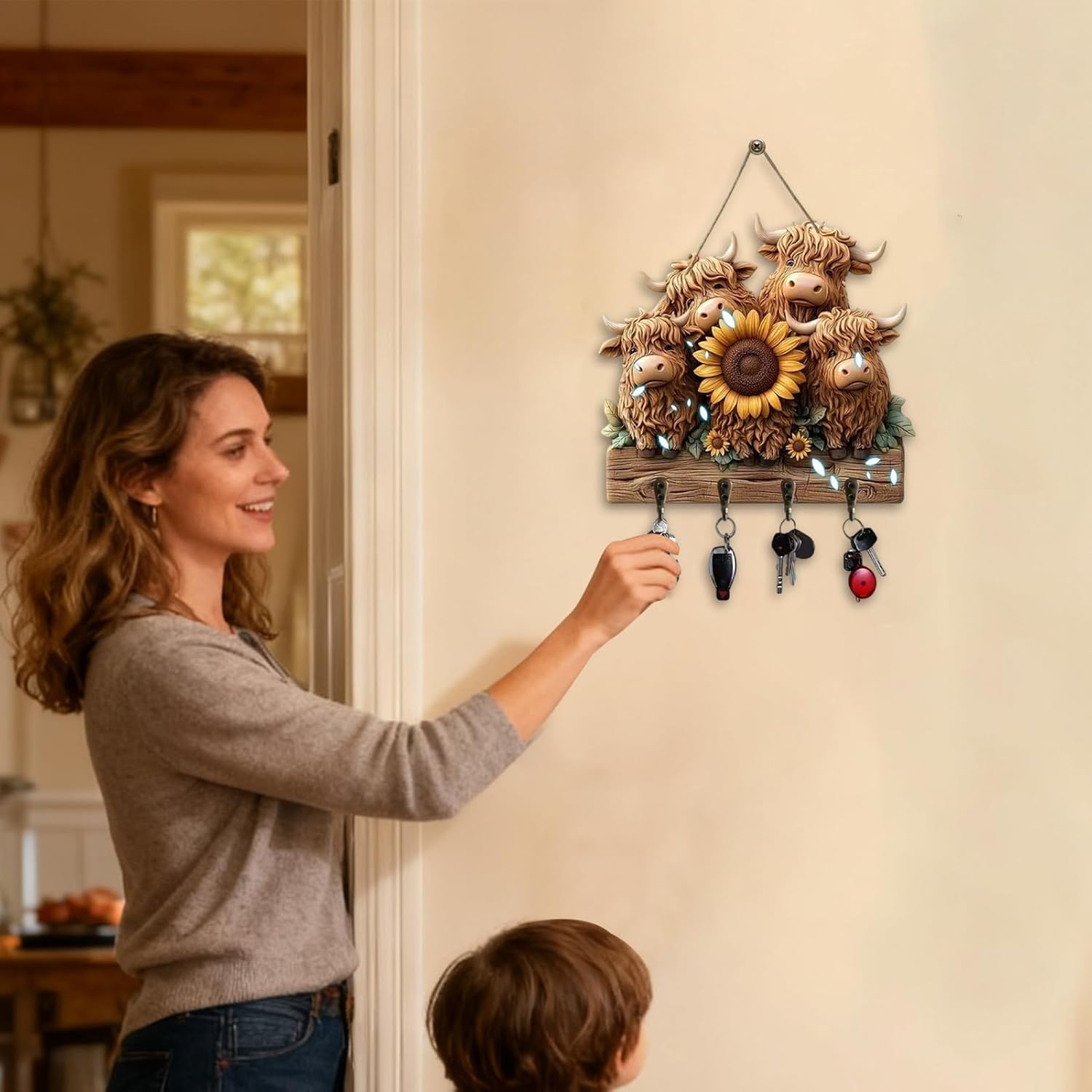 魅力的な玄関オーガナイザー: この壁掛けキーホルダーは、素朴なスタイルの装飾と日常の利便性を融合させ、実用的でありながらスタイリッシュな家への追加を作成し、新しい始まりを祝う友人や家族への心のこもった贈り物として役立ちます。かわいいキーラックウォールマウントハンガーは、素朴な農家の魅力で家の装飾を強化するように設計された魅力的な木製オーガナイザーです。楽しい牛のデザインが特徴のこのキーラックは、あらゆる空間に面白くて風変わりなタッチを加えます。 4つの頑丈なフックが装備されており、鍵、帽子、バッグ、コート、タオルなどを実用的に収納できます。玄関、リビングルーム、キッチン、寝室、オフィス、アパート、寮に最適なこの多用途アイテムは、ご自宅の美観を高めながら、必要なアイテムを整理整頓できます。その素朴なスタイルはさまざまなインテリアテーマにシームレスに溶け込み、日常生活への理想的な追加になります。このかわいいキーラックを使用して、装飾的かつ機能的な利点を楽しみながら、スペースを整理して整理してください。