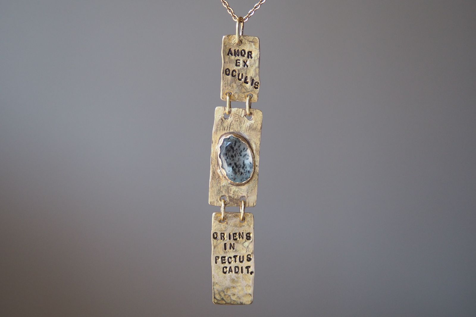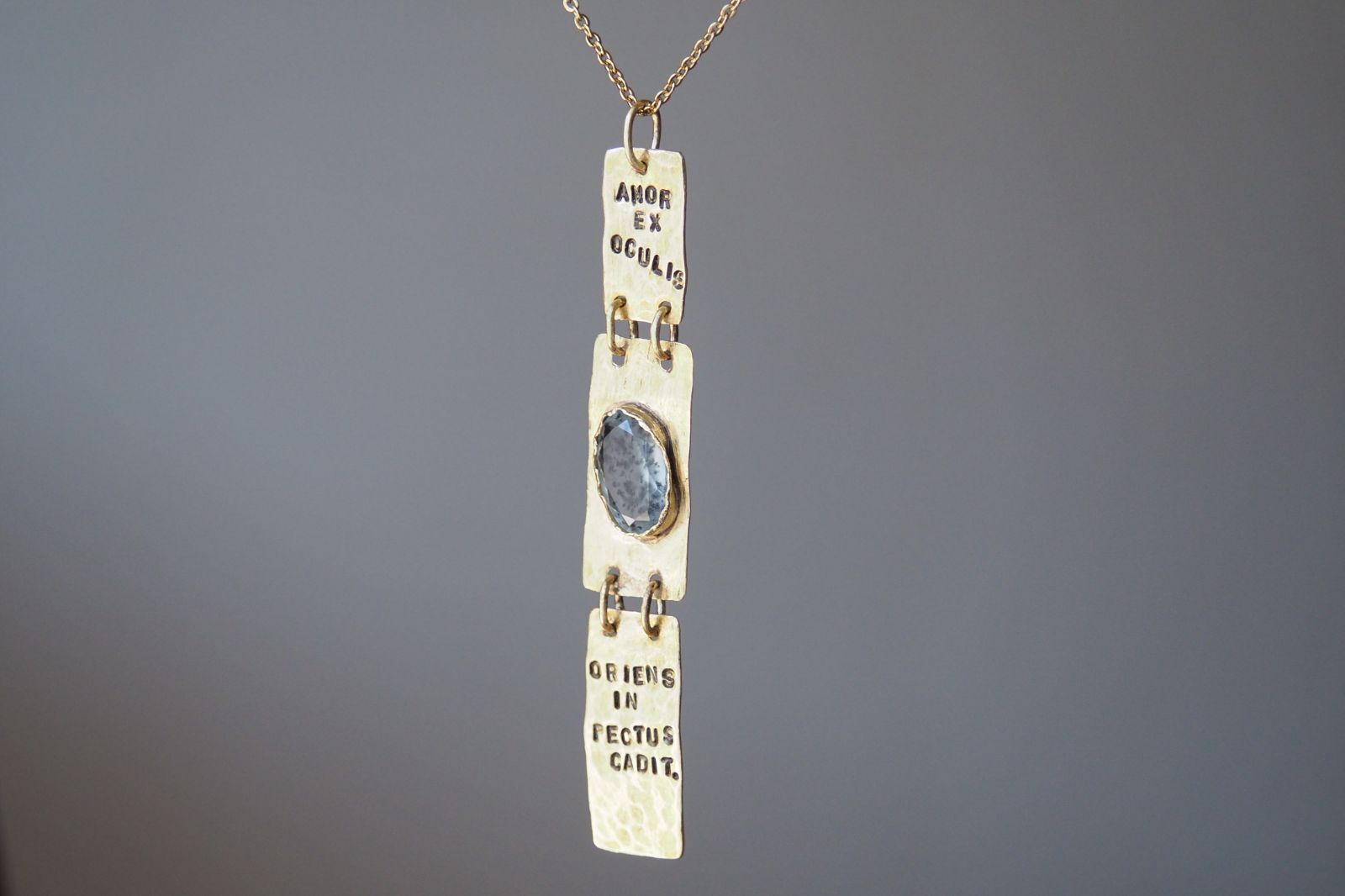 真鍮プレートを切り出し刻印と槌目をつけ穴を開け、枠にする薄い真鍮板やカンのつなぎ目を段階的に銀ロウ付け(溶接)、モスアクアマリンをとりつけました