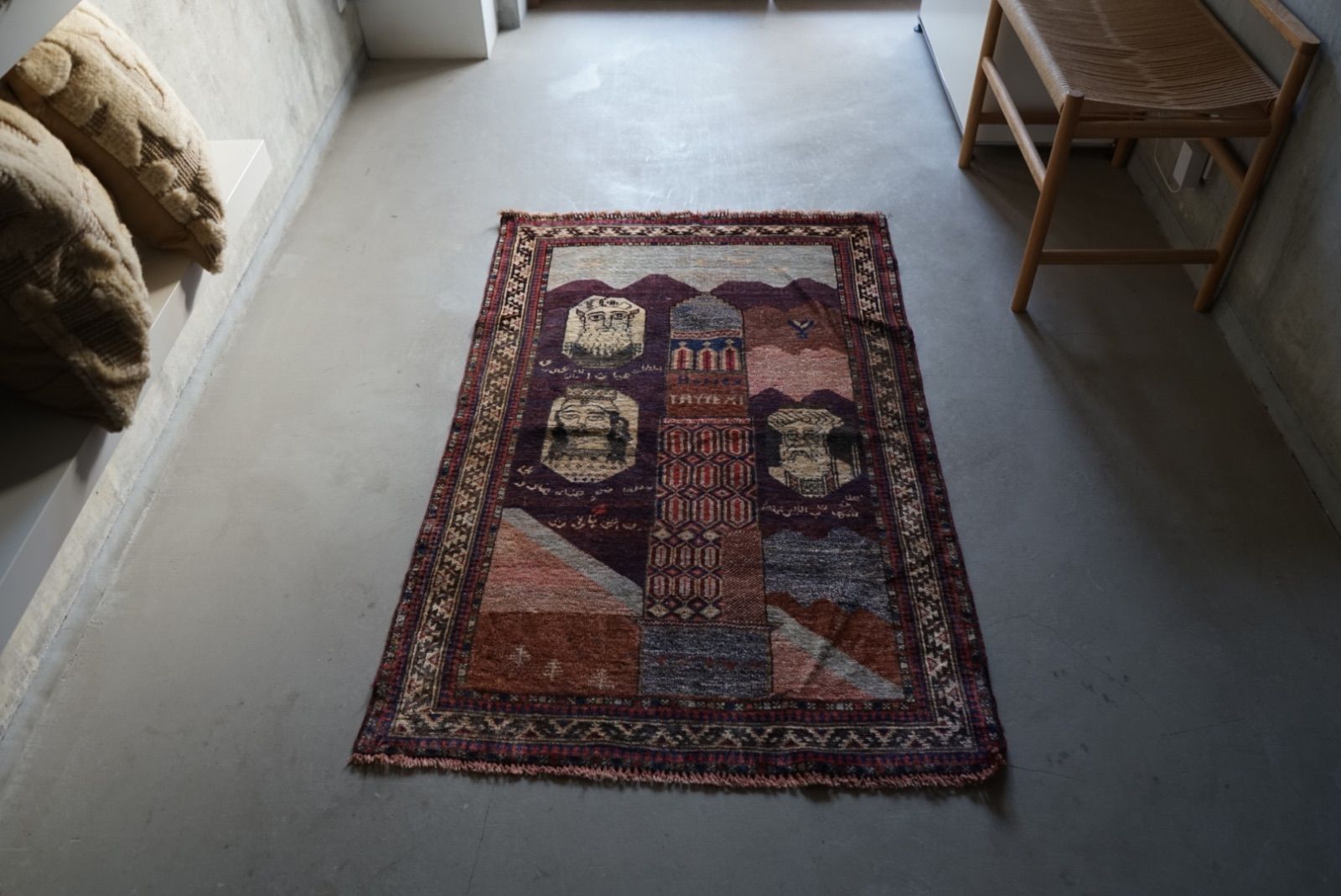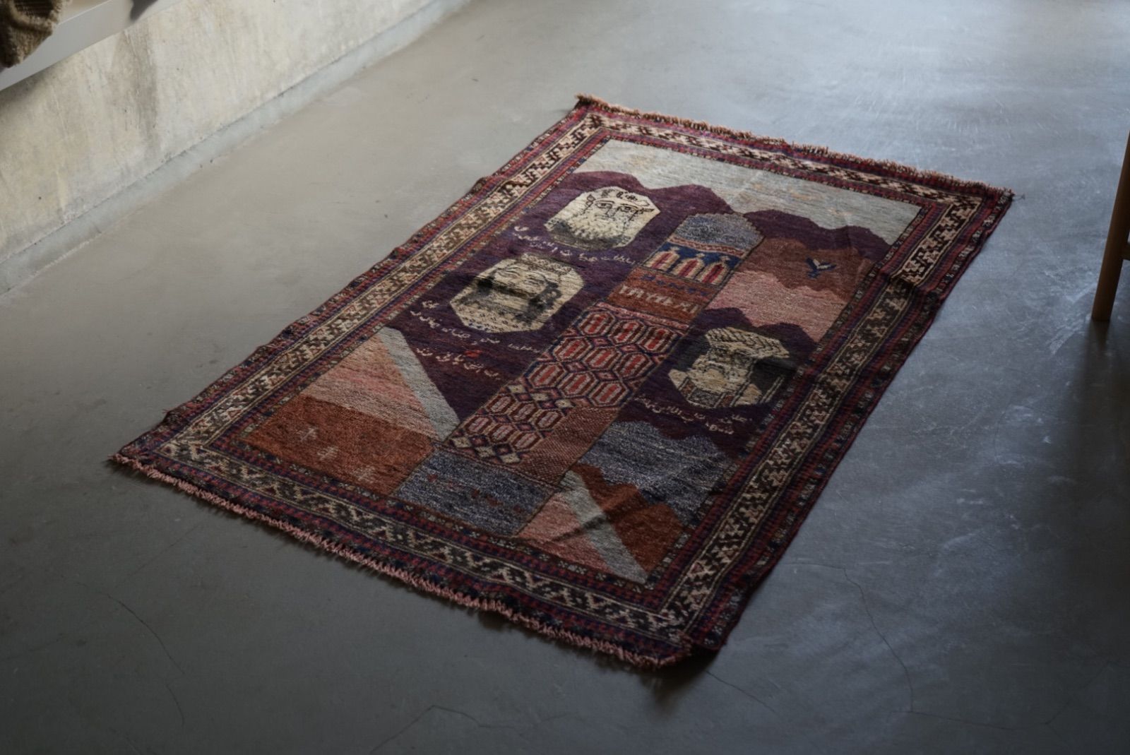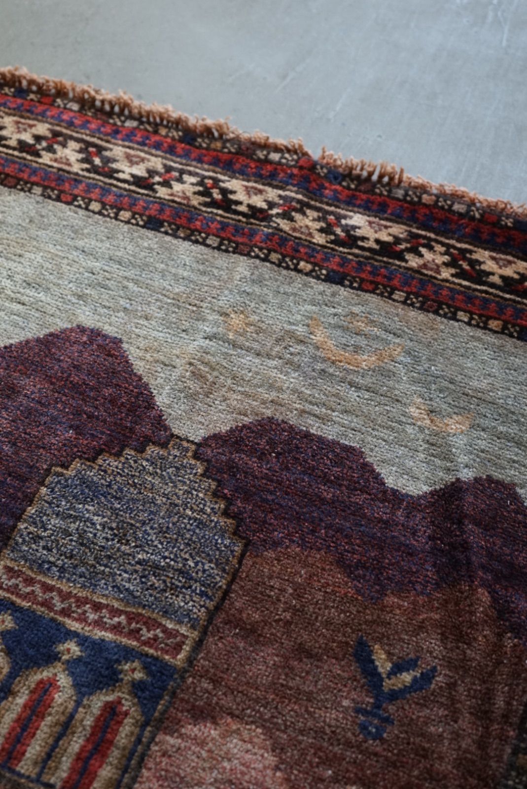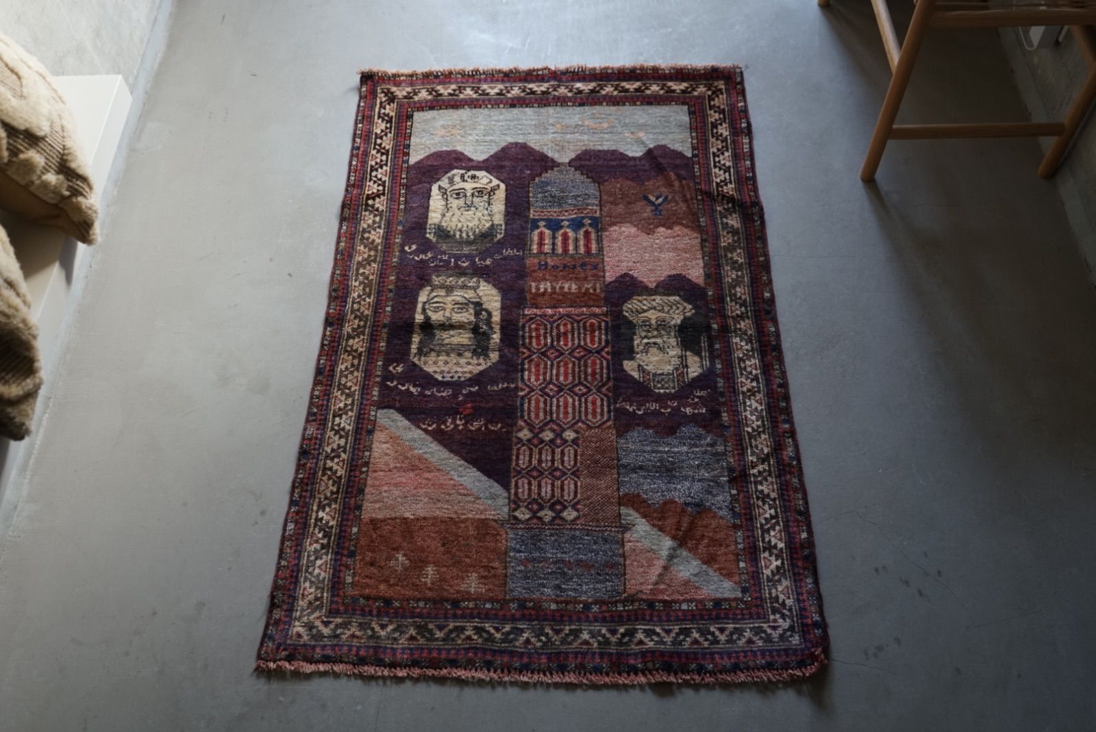 青空に浮かぶ月と星がきれい。多色づかいながらも色の馴染みが絶妙です。 絵画のようなアフガンバルーチラグ。タイトルはMINARET OF JAMという名所です。側には歴史上の王子、王妃が描かれています。 ややコンパクトなサイズ感はプレイヤーサイズ。人ひとりが寛げるものになっています。 リビングやデスクを飾る絨毯として、また特別な空間演出が出来る寝室へもお薦めです。 表面の羊毛はソフトタッチで滑らか、素足で乗ってもとても快適です。ウールとウールで織ってありますのでしなやかな佇まいです。 状態良好、厚みは4mm程度になります。 AFGHANISTAN OLD BALUCH 1970年代 133 × 87 cm 素材:wool , cotton / natural dye ※ こちらはオールド品です。 商品ページではお伝えしきれないような風合い、ゆがみ、状態、補修がございます。ご理解のある方へお届けさせて下さい。 ※ 当店にてすでに洗浄・検品・お手入れ済みです。ご購入後お部屋ですぐに気持ちよくお使い頂けます。 ※ ウールのニオイはわずかに残ります。デリケートな方は実店舗にてお確かめくださいませ。 ※ 羊毛絨毯は使用中にウール繊維の粉が周囲に生じます。天然素材の特徴としてご理解ください。 ※ 撮影は全て自然光、又は店内照明の下で行なっております。写真の加工もしておりません。実物と差がある場合は陰影の差、またはカメラの性能の差になります。 -お手入れ- 1) ほこりの除去 ラグには小さな埃が集まるので、定期的な掃除機での手入れをおすすめします。砂利やほこりは定期的に掃き掃除してあげて下さい。絨毯の目の中にたまるとすり傷となり、消耗の原因となります。 2) 除湿 定期的に風通しの良い場所で干すと絨毯は喜びます。 (ただし日光による日焼けには注意してください) 慣れた方ですと数ヶ月おきに敷く場所を変えておられます。常時の湿気は大敵。絨毯のケアの為に除湿を心がけて下さい。一時的な水濡れなどは、適時干して乾かしてあげるだけで十分に対処出来ます。 3) 液体汚れ 飲み物をこぼしたりした場合は、乾いた布巾で吸収させて下さい。濃いものは少量の天然洗剤を十分な水で薄めて利用し、布で叩いて拭き取ってください。擦ると傷みの原因となります。 4) 水洗い 当店のすべての羊毛絨毯は水洗いして頂けます。"洗って繰り返し使う"そんな暮らしの道具としての絨毯を理想としています。 --------------------------- イランから集めた手織りのアンティークラグ VINTAGE CARPETS & ANTIQUES MAISON ÉTRETAT メゾンエトルタ 〈住所〉 京都市北区平野上八丁柳町30 〈電話〉 075-286-7051 (営業時間内のみ対応) 〈営業時間〉 OPEN 13-18時 月金土日祝 その他曜日、時間はメールご予約にて来店下さい