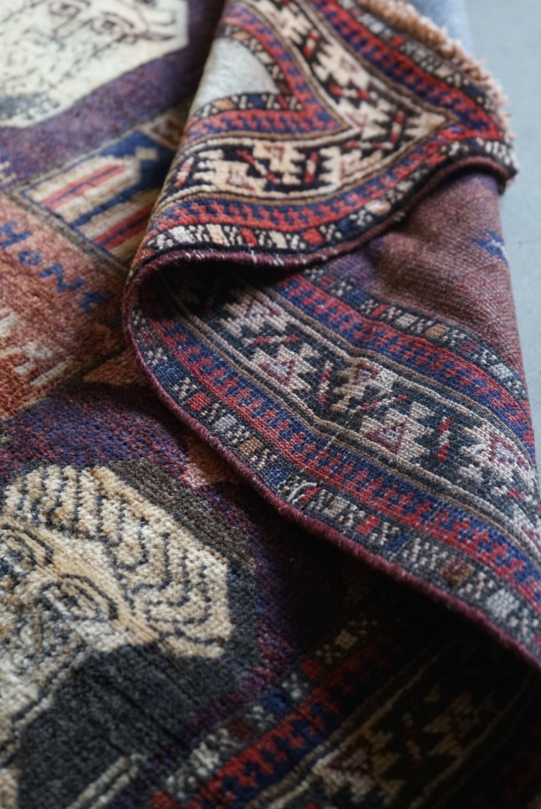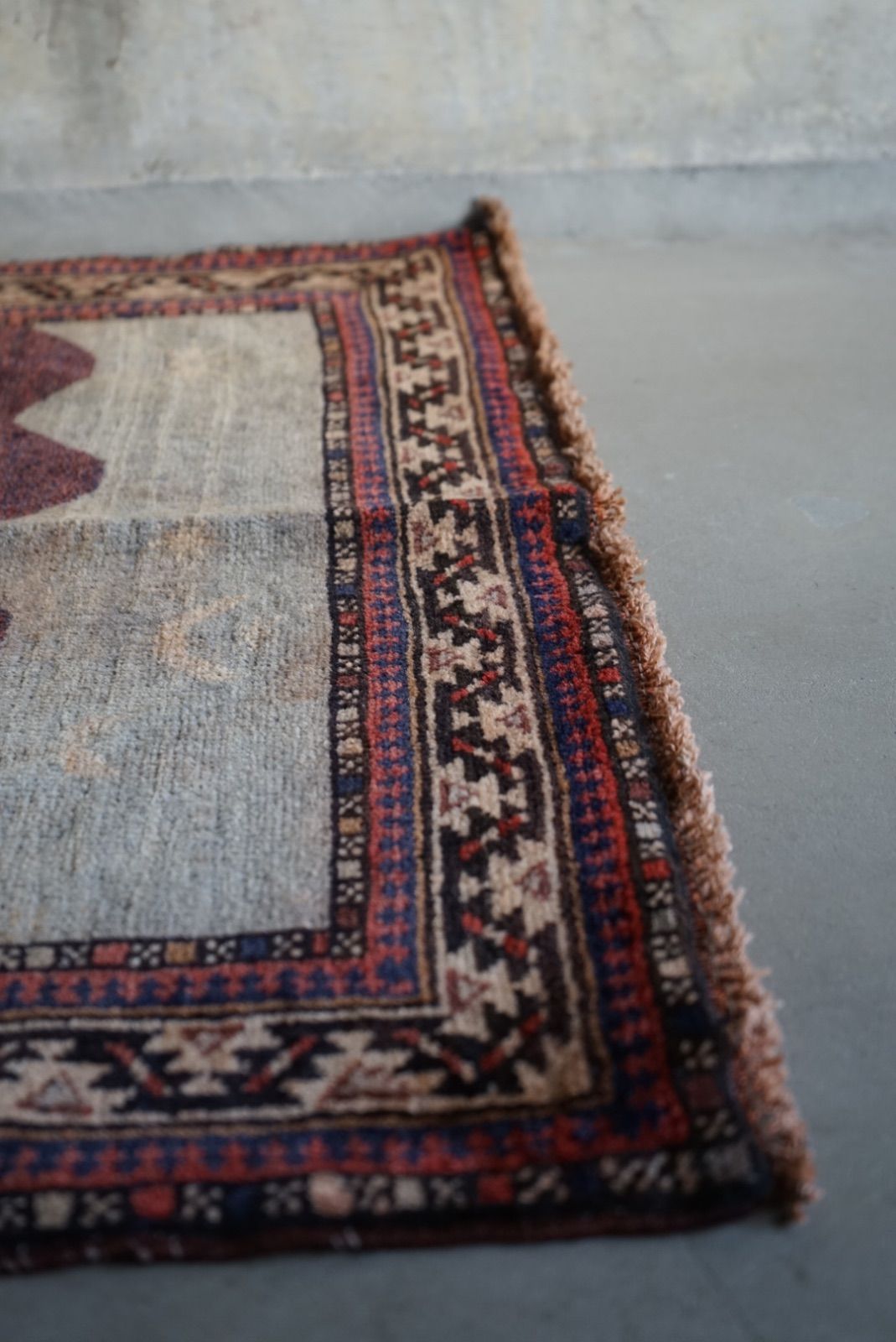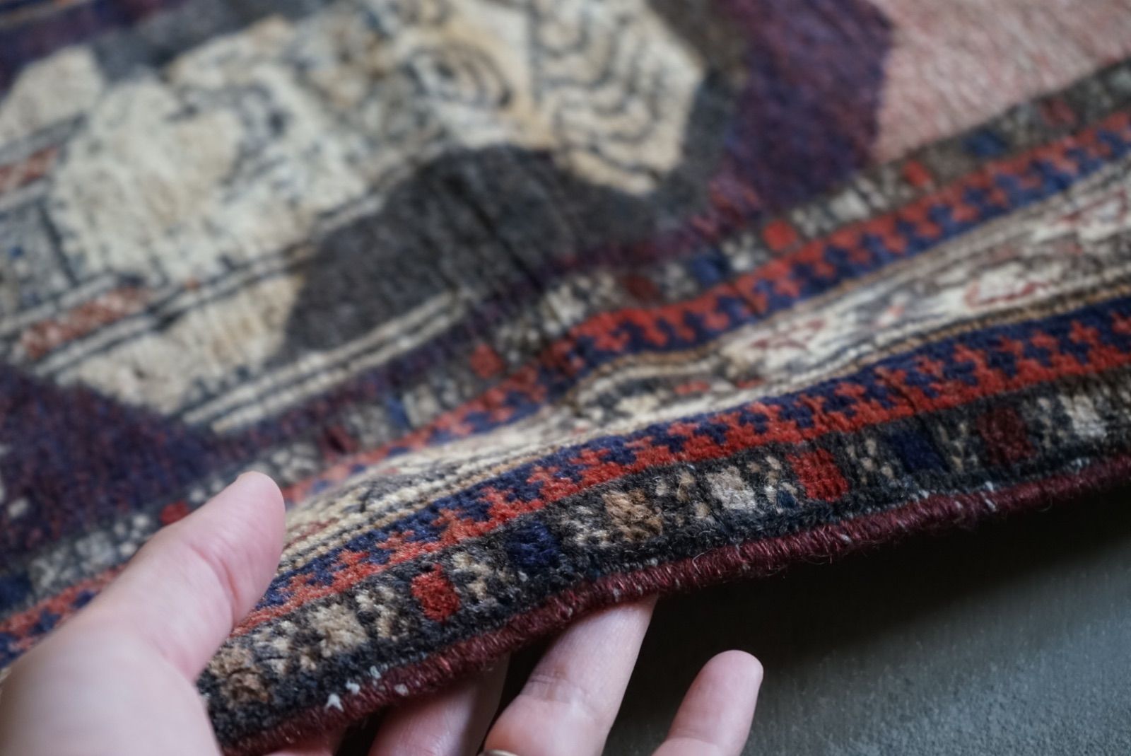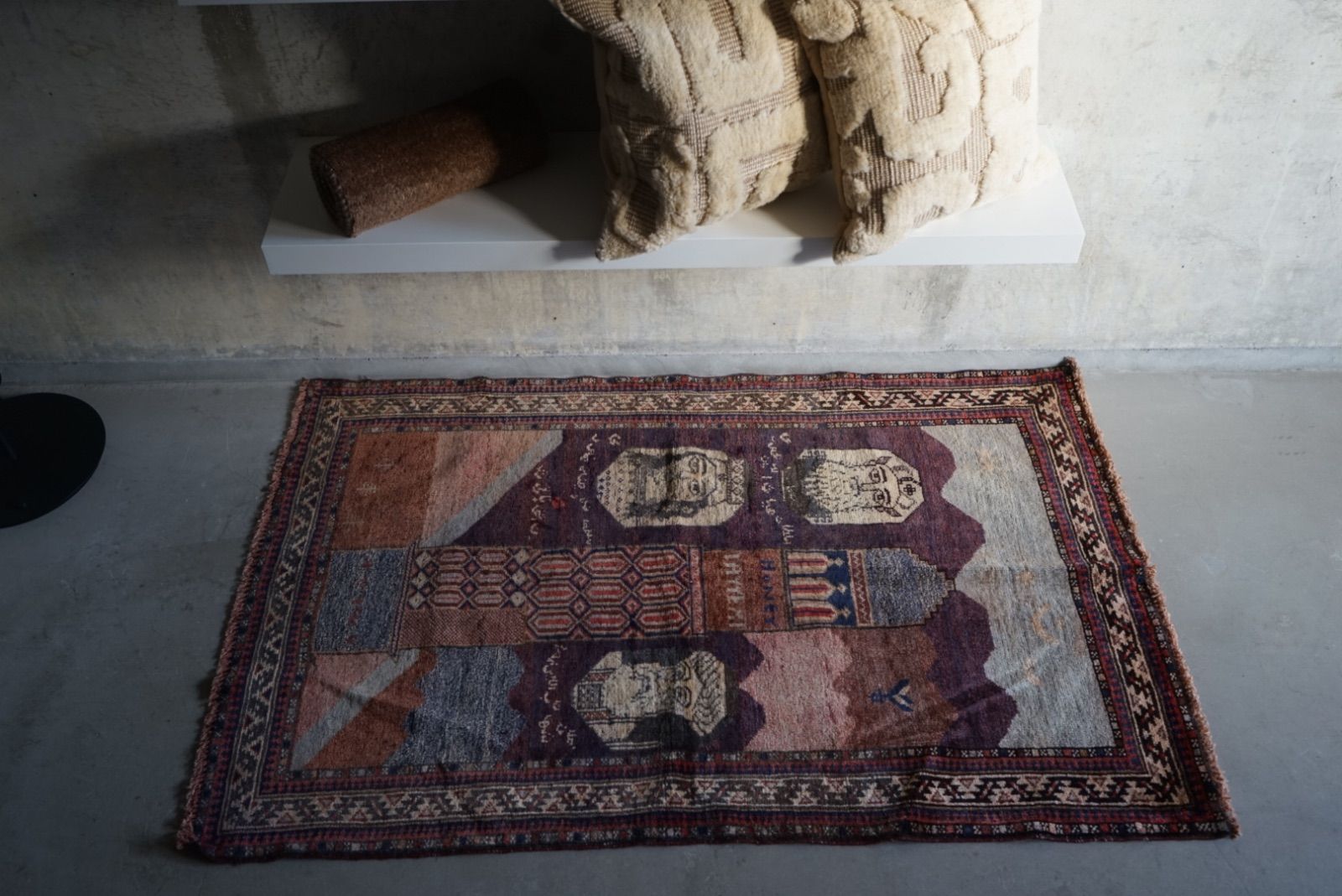 青空に浮かぶ月と星がきれい。多色づかいながらも色の馴染みが絶妙です。 絵画のようなアフガンバルーチラグ。タイトルはMINARET OF JAMという名所です。側には歴史上の王子、王妃が描かれています。 ややコンパクトなサイズ感はプレイヤーサイズ。人ひとりが寛げるものになっています。 リビングやデスクを飾る絨毯として、また特別な空間演出が出来る寝室へもお薦めです。 表面の羊毛はソフトタッチで滑らか、素足で乗ってもとても快適です。ウールとウールで織ってありますのでしなやかな佇まいです。 状態良好、厚みは4mm程度になります。 AFGHANISTAN OLD BALUCH 1970年代 133 × 87 cm 素材:wool , cotton / natural dye ※ こちらはオールド品です。 商品ページではお伝えしきれないような風合い、ゆがみ、状態、補修がございます。ご理解のある方へお届けさせて下さい。 ※ 当店にてすでに洗浄・検品・お手入れ済みです。ご購入後お部屋ですぐに気持ちよくお使い頂けます。 ※ ウールのニオイはわずかに残ります。デリケートな方は実店舗にてお確かめくださいませ。 ※ 羊毛絨毯は使用中にウール繊維の粉が周囲に生じます。天然素材の特徴としてご理解ください。 ※ 撮影は全て自然光、又は店内照明の下で行なっております。写真の加工もしておりません。実物と差がある場合は陰影の差、またはカメラの性能の差になります。 -お手入れ- 1) ほこりの除去 ラグには小さな埃が集まるので、定期的な掃除機での手入れをおすすめします。砂利やほこりは定期的に掃き掃除してあげて下さい。絨毯の目の中にたまるとすり傷となり、消耗の原因となります。 2) 除湿 定期的に風通しの良い場所で干すと絨毯は喜びます。 (ただし日光による日焼けには注意してください) 慣れた方ですと数ヶ月おきに敷く場所を変えておられます。常時の湿気は大敵。絨毯のケアの為に除湿を心がけて下さい。一時的な水濡れなどは、適時干して乾かしてあげるだけで十分に対処出来ます。 3) 液体汚れ 飲み物をこぼしたりした場合は、乾いた布巾で吸収させて下さい。濃いものは少量の天然洗剤を十分な水で薄めて利用し、布で叩いて拭き取ってください。擦ると傷みの原因となります。 4) 水洗い 当店のすべての羊毛絨毯は水洗いして頂けます。"洗って繰り返し使う"そんな暮らしの道具としての絨毯を理想としています。 --------------------------- イランから集めた手織りのアンティークラグ VINTAGE CARPETS & ANTIQUES MAISON ÉTRETAT メゾンエトルタ 〈住所〉 京都市北区平野上八丁柳町30 〈電話〉 075-286-7051 (営業時間内のみ対応) 〈営業時間〉 OPEN 13-18時 月金土日祝 その他曜日、時間はメールご予約にて来店下さい