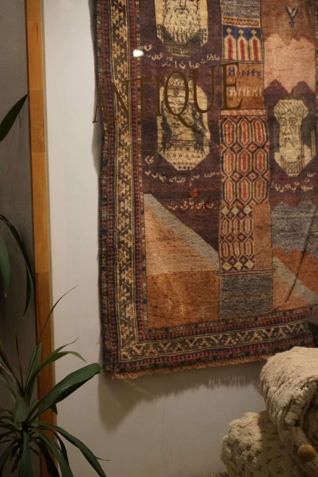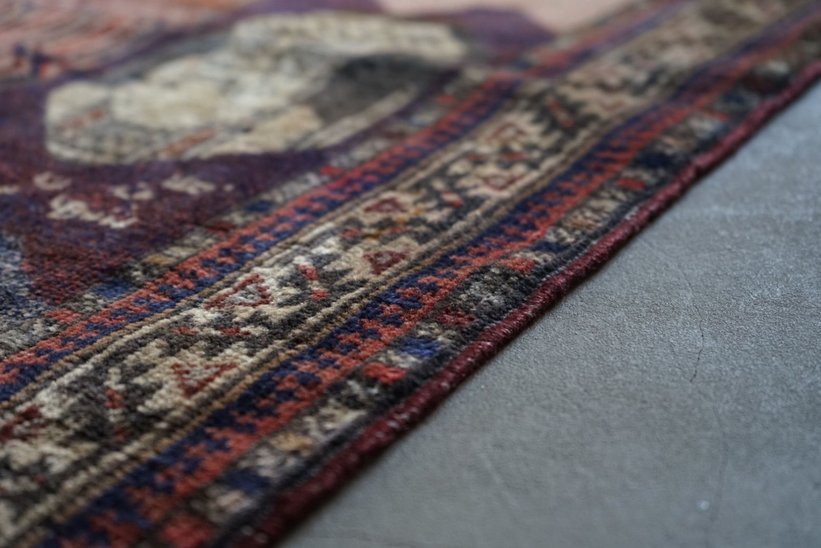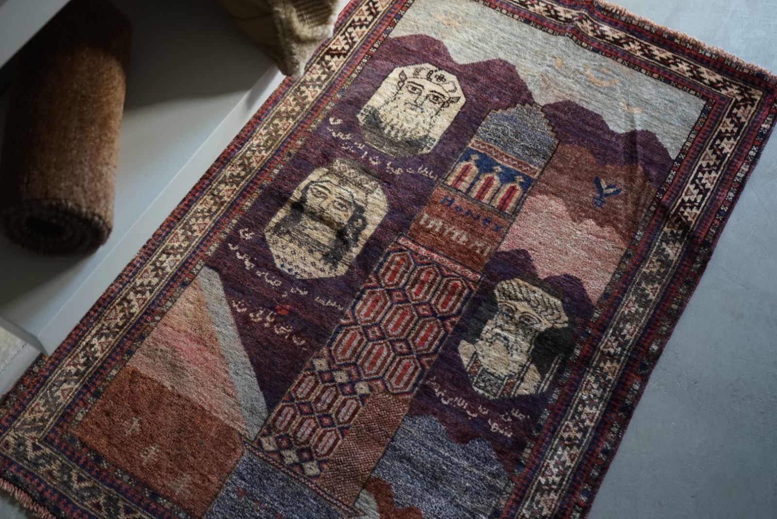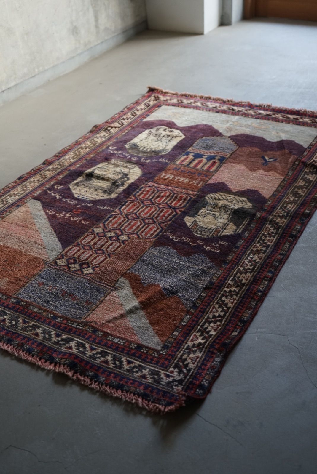青空に浮かぶ月と星がきれい。多色づかいながらも色の馴染みが絶妙です。 絵画のようなアフガンバルーチラグ。タイトルはMINARET OF JAMという名所です。側には歴史上の王子、王妃が描かれています。 ややコンパクトなサイズ感はプレイヤーサイズ。人ひとりが寛げるものになっています。 リビングやデスクを飾る絨毯として、また特別な空間演出が出来る寝室へもお薦めです。 表面の羊毛はソフトタッチで滑らか、素足で乗ってもとても快適です。ウールとウールで織ってありますのでしなやかな佇まいです。 状態良好、厚みは4mm程度になります。 AFGHANISTAN OLD BALUCH 1970年代 133 × 87 cm 素材:wool , cotton / natural dye ※ こちらはオールド品です。 商品ページではお伝えしきれないような風合い、ゆがみ、状態、補修がございます。ご理解のある方へお届けさせて下さい。 ※ 当店にてすでに洗浄・検品・お手入れ済みです。ご購入後お部屋ですぐに気持ちよくお使い頂けます。 ※ ウールのニオイはわずかに残ります。デリケートな方は実店舗にてお確かめくださいませ。 ※ 羊毛絨毯は使用中にウール繊維の粉が周囲に生じます。天然素材の特徴としてご理解ください。 ※ 撮影は全て自然光、又は店内照明の下で行なっております。写真の加工もしておりません。実物と差がある場合は陰影の差、またはカメラの性能の差になります。 -お手入れ- 1) ほこりの除去 ラグには小さな埃が集まるので、定期的な掃除機での手入れをおすすめします。砂利やほこりは定期的に掃き掃除してあげて下さい。絨毯の目の中にたまるとすり傷となり、消耗の原因となります。 2) 除湿 定期的に風通しの良い場所で干すと絨毯は喜びます。 (ただし日光による日焼けには注意してください) 慣れた方ですと数ヶ月おきに敷く場所を変えておられます。常時の湿気は大敵。絨毯のケアの為に除湿を心がけて下さい。一時的な水濡れなどは、適時干して乾かしてあげるだけで十分に対処出来ます。 3) 液体汚れ 飲み物をこぼしたりした場合は、乾いた布巾で吸収させて下さい。濃いものは少量の天然洗剤を十分な水で薄めて利用し、布で叩いて拭き取ってください。擦ると傷みの原因となります。 4) 水洗い 当店のすべての羊毛絨毯は水洗いして頂けます。"洗って繰り返し使う"そんな暮らしの道具としての絨毯を理想としています。 --------------------------- イランから集めた手織りのアンティークラグ VINTAGE CARPETS & ANTIQUES MAISON ÉTRETAT メゾンエトルタ 〈住所〉 京都市北区平野上八丁柳町30 〈電話〉 075-286-7051 (営業時間内のみ対応) 〈営業時間〉 OPEN 13-18時 月金土日祝 その他曜日、時間はメールご予約にて来店下さい