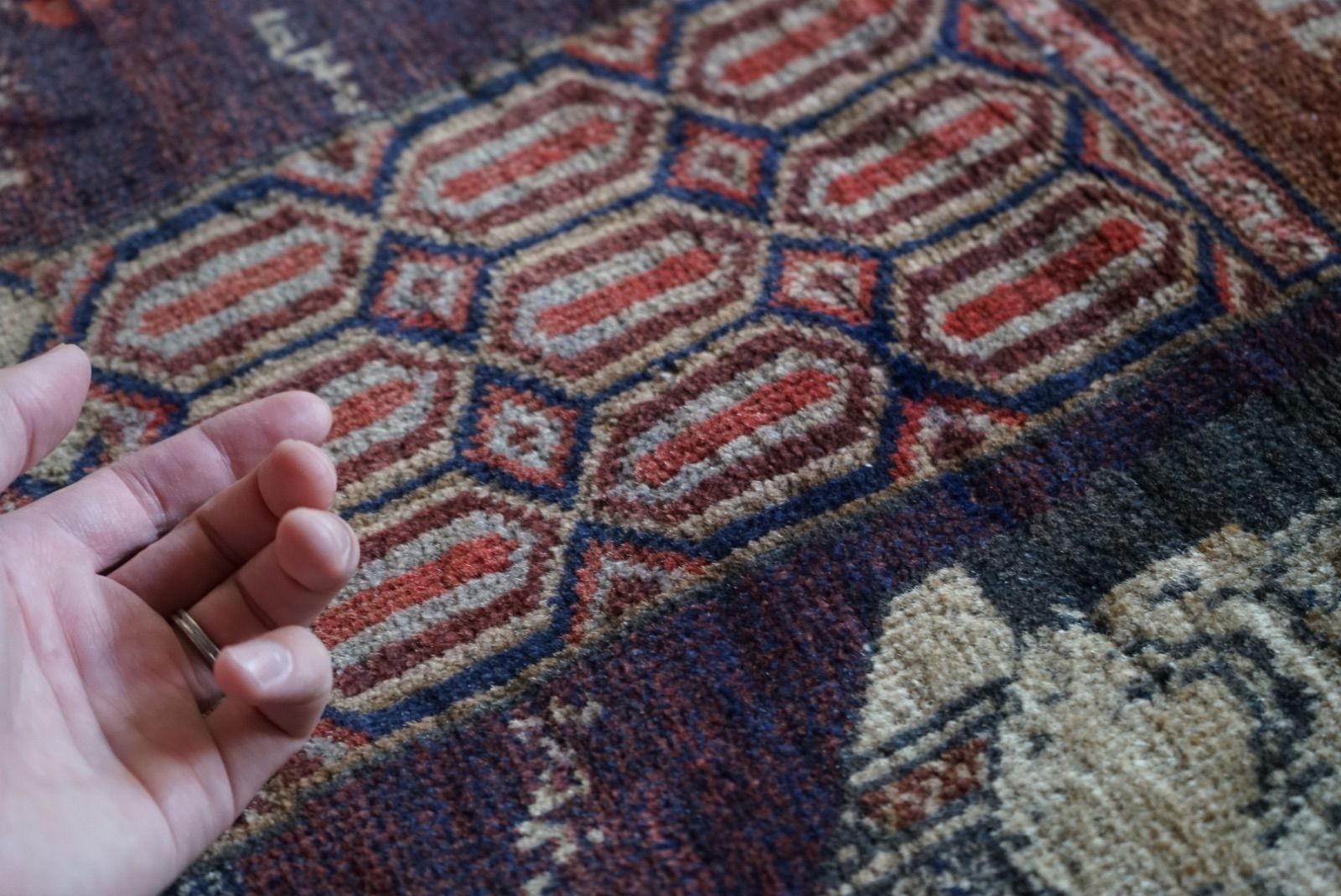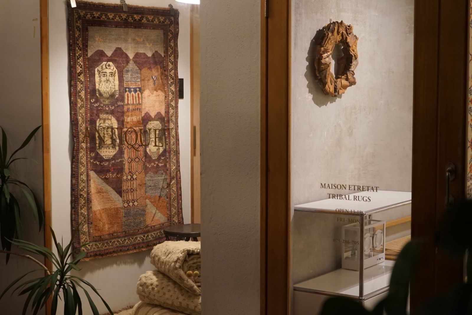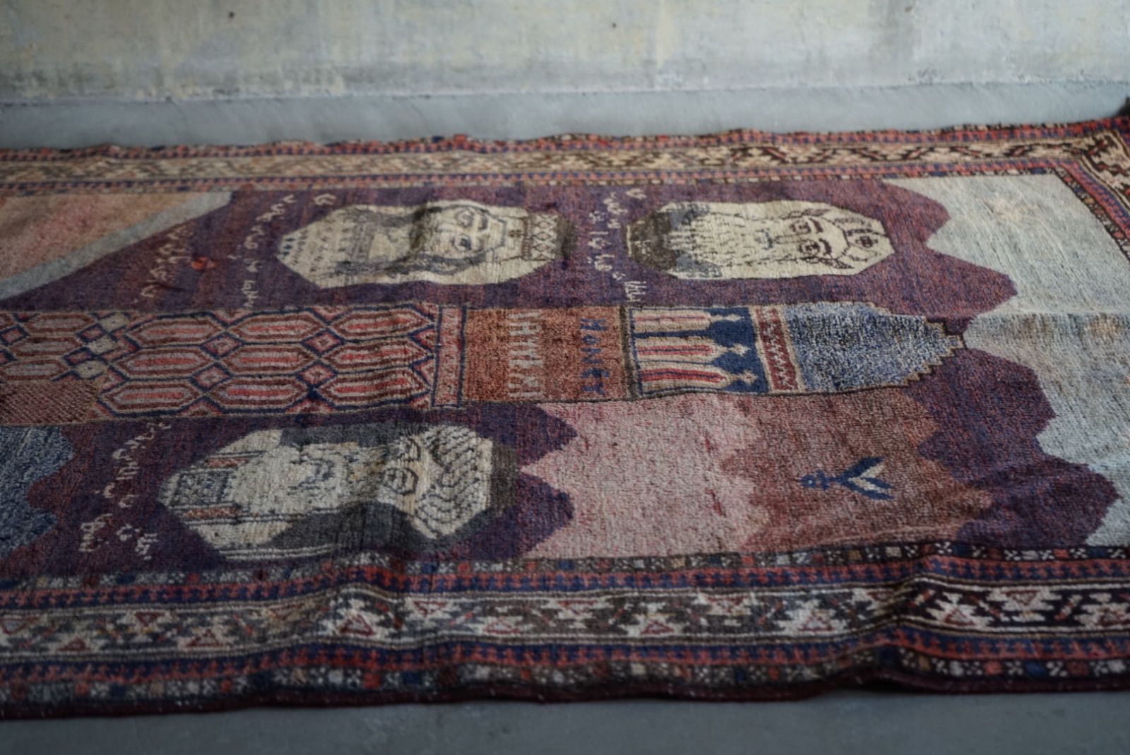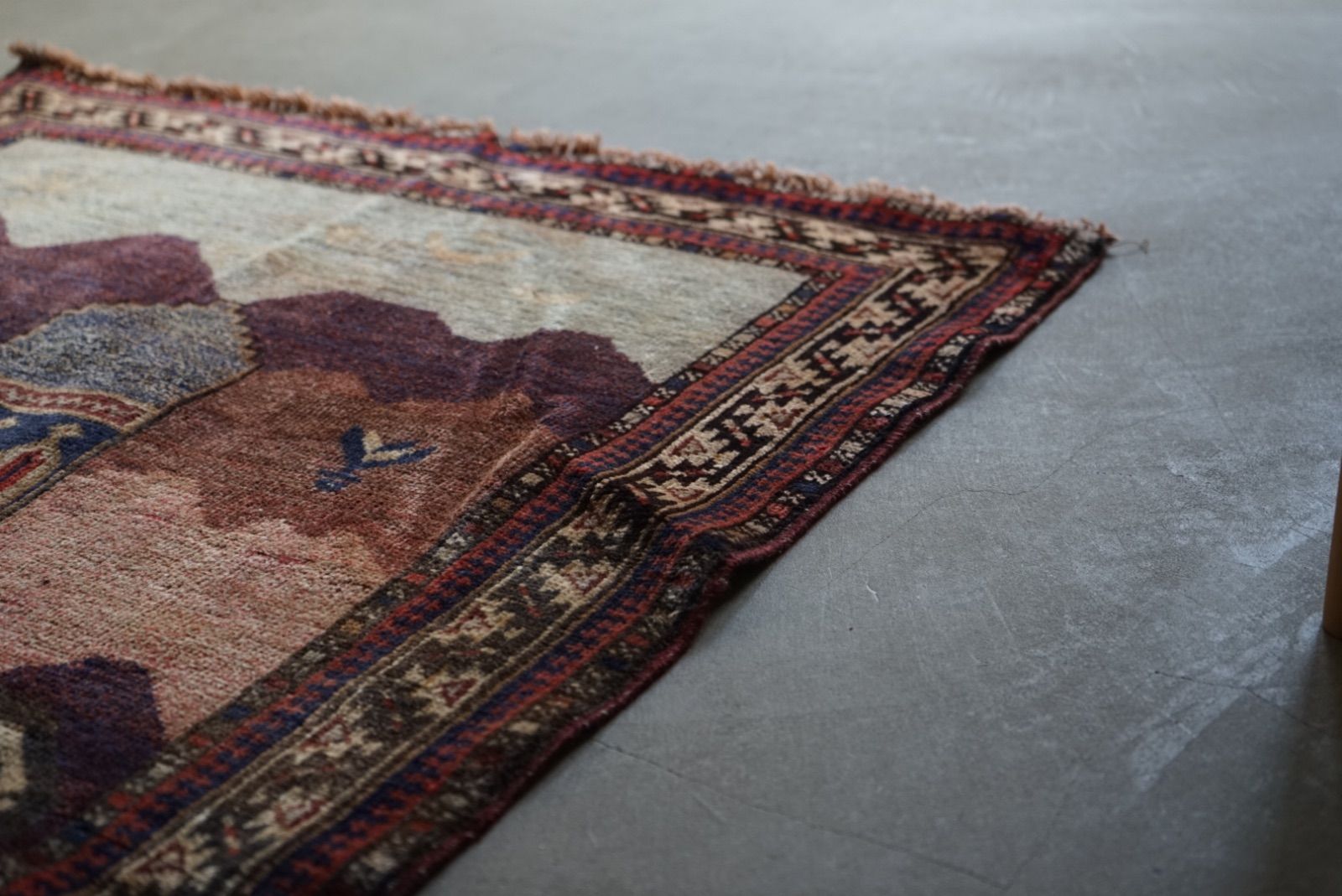 青空に浮かぶ月と星がきれい。多色づかいながらも色の馴染みが絶妙です。 絵画のようなアフガンバルーチラグ。タイトルはMINARET OF JAMという名所です。側には歴史上の王子、王妃が描かれています。 ややコンパクトなサイズ感はプレイヤーサイズ。人ひとりが寛げるものになっています。 リビングやデスクを飾る絨毯として、また特別な空間演出が出来る寝室へもお薦めです。 表面の羊毛はソフトタッチで滑らか、素足で乗ってもとても快適です。ウールとウールで織ってありますのでしなやかな佇まいです。 状態良好、厚みは4mm程度になります。 AFGHANISTAN OLD BALUCH 1970年代 133 × 87 cm 素材:wool , cotton / natural dye ※ こちらはオールド品です。 商品ページではお伝えしきれないような風合い、ゆがみ、状態、補修がございます。ご理解のある方へお届けさせて下さい。 ※ 当店にてすでに洗浄・検品・お手入れ済みです。ご購入後お部屋ですぐに気持ちよくお使い頂けます。 ※ ウールのニオイはわずかに残ります。デリケートな方は実店舗にてお確かめくださいませ。 ※ 羊毛絨毯は使用中にウール繊維の粉が周囲に生じます。天然素材の特徴としてご理解ください。 ※ 撮影は全て自然光、又は店内照明の下で行なっております。写真の加工もしておりません。実物と差がある場合は陰影の差、またはカメラの性能の差になります。 -お手入れ- 1) ほこりの除去 ラグには小さな埃が集まるので、定期的な掃除機での手入れをおすすめします。砂利やほこりは定期的に掃き掃除してあげて下さい。絨毯の目の中にたまるとすり傷となり、消耗の原因となります。 2) 除湿 定期的に風通しの良い場所で干すと絨毯は喜びます。 (ただし日光による日焼けには注意してください) 慣れた方ですと数ヶ月おきに敷く場所を変えておられます。常時の湿気は大敵。絨毯のケアの為に除湿を心がけて下さい。一時的な水濡れなどは、適時干して乾かしてあげるだけで十分に対処出来ます。 3) 液体汚れ 飲み物をこぼしたりした場合は、乾いた布巾で吸収させて下さい。濃いものは少量の天然洗剤を十分な水で薄めて利用し、布で叩いて拭き取ってください。擦ると傷みの原因となります。 4) 水洗い 当店のすべての羊毛絨毯は水洗いして頂けます。"洗って繰り返し使う"そんな暮らしの道具としての絨毯を理想としています。 --------------------------- イランから集めた手織りのアンティークラグ VINTAGE CARPETS & ANTIQUES MAISON ÉTRETAT メゾンエトルタ 〈住所〉 京都市北区平野上八丁柳町30 〈電話〉 075-286-7051 (営業時間内のみ対応) 〈営業時間〉 OPEN 13-18時 月金土日祝 その他曜日、時間はメールご予約にて来店下さい