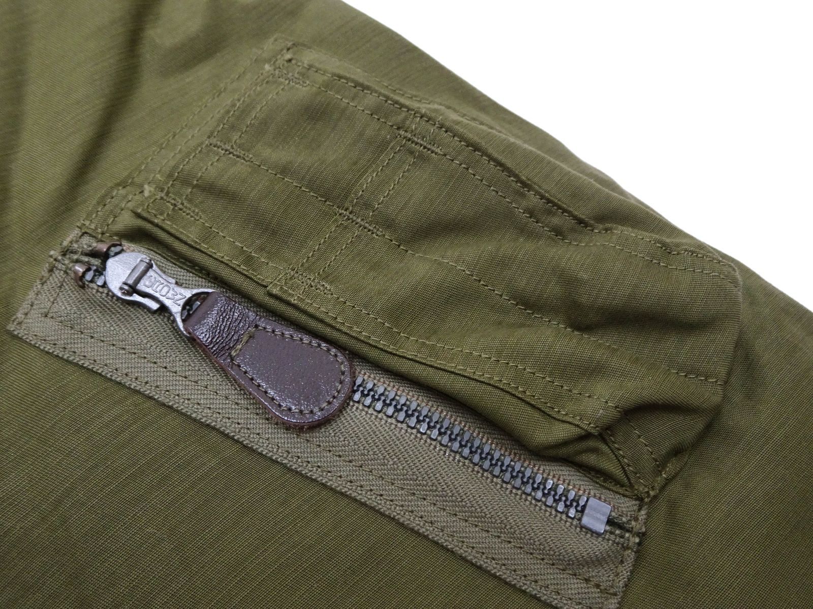 表地には、高密度に織り上げられたレーヨンコットン混紡生地(レーヨン50%/コットン50%)のオリーブカラーが使用されています。このストレッチ性のない生地は、高い耐久性とハリのあるしっかりとした手触りを備えており、レーヨン混紡ならではのしなやかな質感も兼ね備えています。近くで見ると、表面には細いライン状の織り目が浮かび上がり、特徴的な横方向の畝に加えて、同系色のかすかな色ムラが筋状に走る表情が見て取れます。糸のわずかなムラ感が穏やかに不均一なスラブ調の質感を生み出し、生地全体にミリタリーライクな独特な雰囲気を与えています。