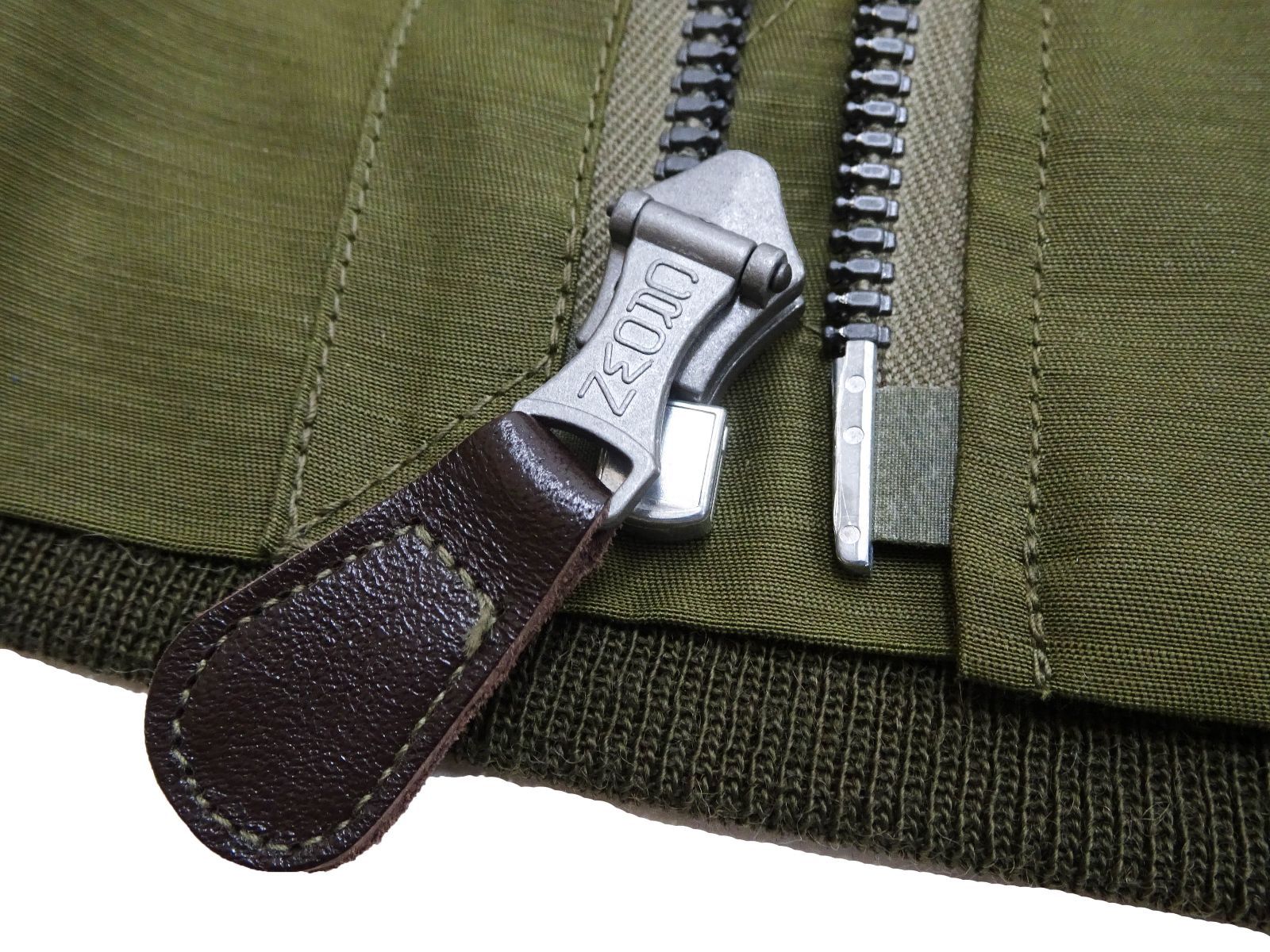 左胸付近のジップ脇には、酸素マスクのホースをクリップで固定する目的の馬革製の長方形型レザーオキシジェンタブが付けられています。両脇にはスナップボタン留のICSコードループが配されています。