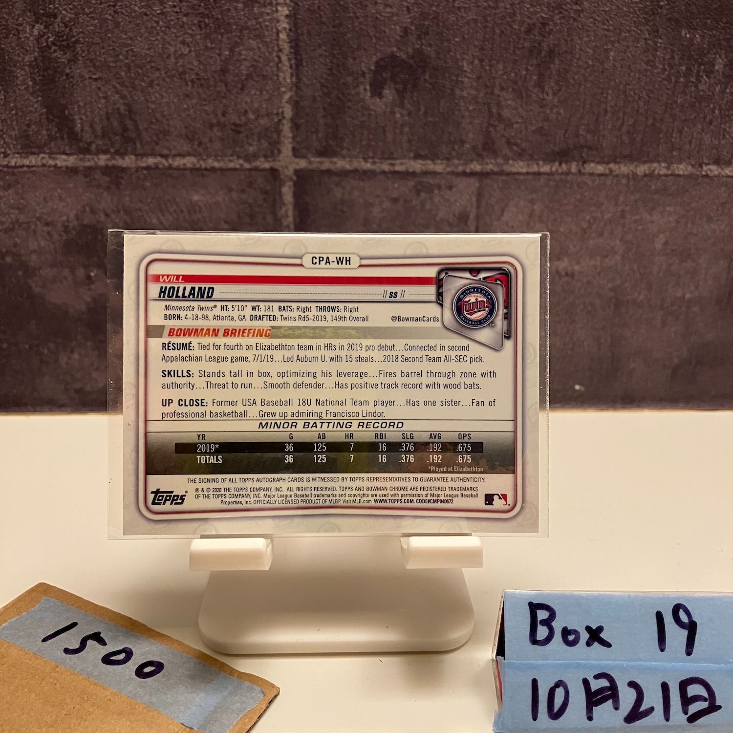 2020 Topps 1st Bowman Chrome Will Holland 直筆サインカード MINNESOTA TWINS カード