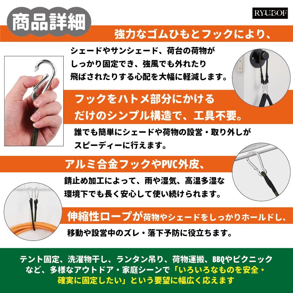 RYUBOF シェード 取り付け金具 セット 強力 フック ゴムバンド 荷台用 固定ベルト 荷締めベルト 伸縮性ロープ サンシェード オーニング ベランダ 日除け 屋外 キャンプ 防風 設営 アウトドア 多用途 耐荷重20kg (2個, [2個] [30cm]