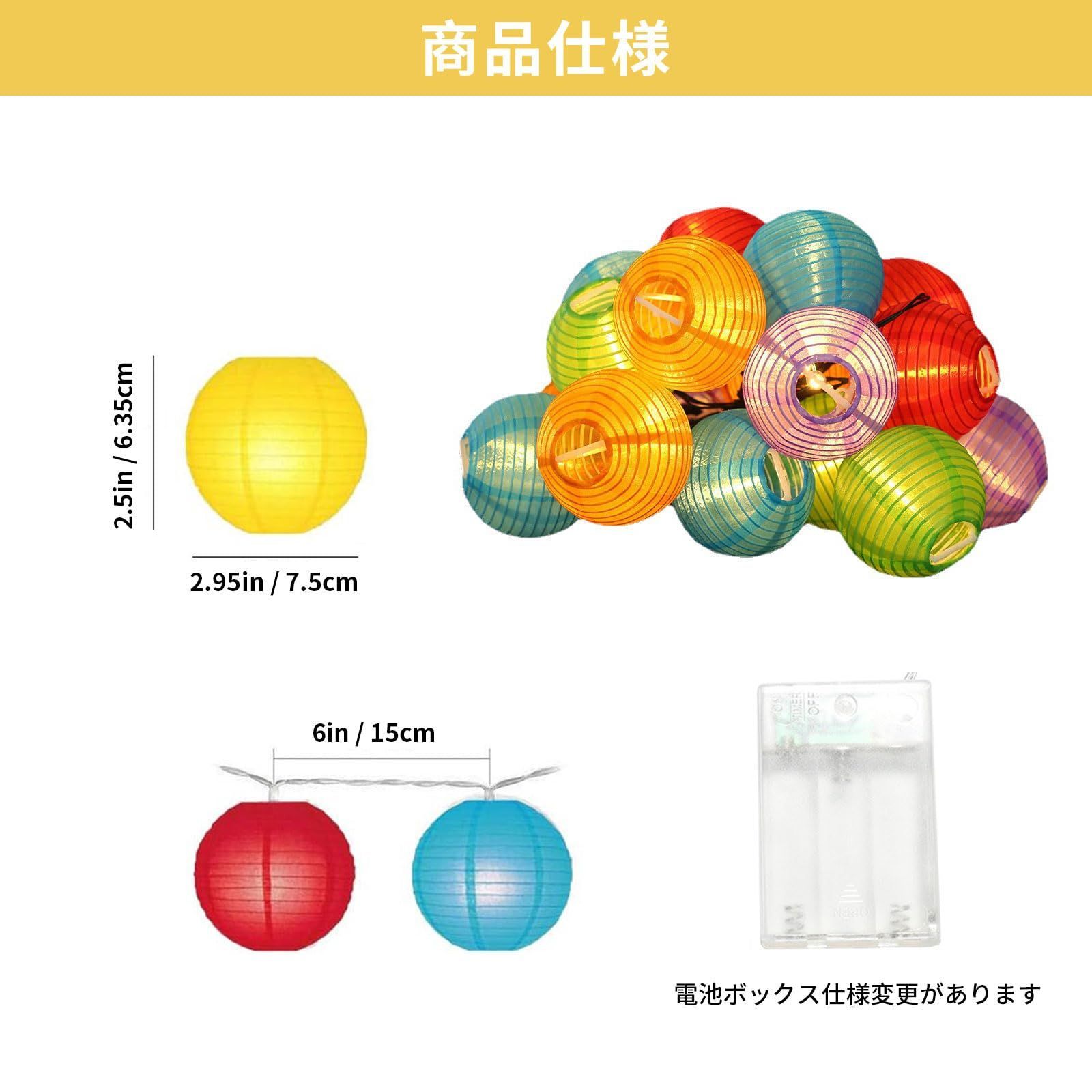 提灯ライト カラフル 紙ちょうちん 6M 40球 ledストリングライト 丸紙ランタン 電池式 無地 夏祭り お盆 祭り イベント パーティー 七夕 飾り キャンプ 庭 ベランダ デコレーション 装飾 店舗用のれん・提灯 【華やかなムードを演出】カラフルなランタン40個が6メートルのラインに並び、直径7.5cmの小さいかわいらしい紙灯が、お祭りやイベントにぴったりの明るくポップな空間を演出します。「常灯」や「点滅」など2つの点灯モードを選ぶことができ、お好みの演出をお楽しみいただけます。 【電源不要・どこにでも設置可能】コンセントいらず!単3形アルカリ乾電池(別売)を使用するので、屋内外問わずどこにでも簡単に設置できます。コンパクトな電池ボックスは持ち運びにも便利で、アウトドアやイベントの装飾に最適です。 【丈夫な素材・防水仕様】提灯本体は破れにくいナイロン素材採用され、屋外でも安心して使用できます。防水性能はIP44相当なので小雨程度なら大丈夫ですが、電池ボックス部分は防水性が限られているため、雨天時は保護カバーなどを使用することをお勧めします。 【簡単組み立て】提灯本体は折り畳み式なので、収納時も場所を取りません。使うときは広げるだけで簡単にセットアップできます。配線不要のシンプル設計、LED電球とブラケットを中に嵌め込むだけで組み立てが完成する、初心者の方でも安心して取り付けられます。 【さまざまなシーンで活躍】無地で丸型の紙提灯はお盆飾り、夏祭り・七夕や結婚式の装飾などとしてはもちろん、玄関先、庭、ベランダ、屋台、キャンプ、新築祝い、開店祝いなどなどさまざまな場所で活躍の理想的なイルミネーションライトです。 色 カラフル ブランド Tonnali 光源タイプ LED 付属コンポーネント 本体 商品の個数 1