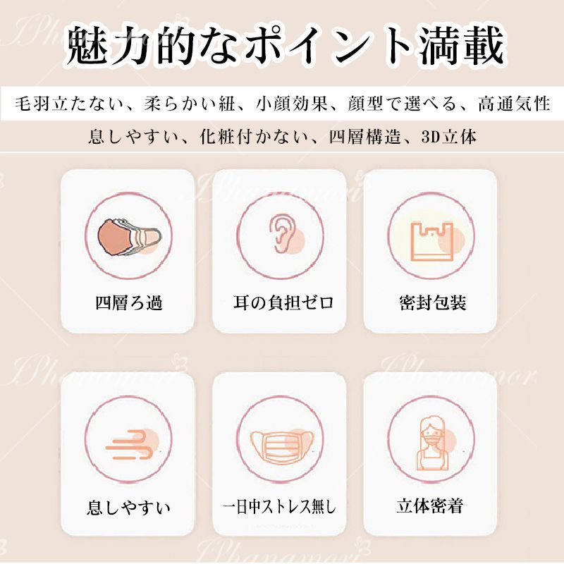 ■商品名:冷感3D立体3層構造カラーマスク ■内容量:55枚/箱 パッケージ箱仕様:53枚(箱、小分け)→55枚(箱、小分け)、順次切り替え ■サイズ: A丸顔13.52cm×11.58cm、C丸顔(小)13.57cm×11.78cm、D面長13.72cm×10.82cm ■形状:3Dマスク ■層:三層式 ■材質:メルトブローン式不織布 マスクの中に程よい空間ができるので、呼吸しやすく、長時間つけていても快適に過ごすことができます。 メイクや口紅などがつきにくく、お肌にも優しい! さらにスキマを抑えた密着性で、横と下からの埃や飛沫などをしっかりガードします。 3D立体構造でスッキリ小顔効果も期待できます。 しっかりフィットしてスッキリフェイスラインを作ります。 【注意事項1】 1、複数ご購入の場合は、1商品ずつご購入手続きをしていただく必要があります。 また、複数ご注文された場合は、自社発送のため、同梱発送とさせていただく場合がありますので、予めご了承いただけますと幸いです。 2、当日16時までにご注文及びお支払いいただいた場合は、当日発送とさせていただきます。 3、お買い求めのバリエーションが選択肢にない場合は、弊店内他の商品ページをご確認ください。 4、お買い求めのバリエーションが在庫切れになった場合は、ショップまでお問い合わせください。 5、弊店では最安値で販売しており、価格交渉を承りかねますので、予めご了承くださいませ。 【注意事項2】 ■ブランド名:jphanamori ■完全なる日本企画、日本デザイン、日本市場向け製品 ■logo付き製品への切り替えを順次進めさせていただいておりますので、予めご了承いただけますと幸いでございます。 ■弊社基準に準じて、最適化になる形状とサイズを採用しております。 サイズだけでみると、微差しかありませんが、形状が全く異なります。 ■パッケージ箱仕様: 53枚入り仕様から55枚入り仕様へ順次切り替えを進めさせていただき、 53枚入りなくなり次第、55枚入りを発送させていただきますことを予めご了承いただけますと幸いでございます。 11枚入り袋仕様から11枚入り箱仕様へ順次切り替えを進めさせていただき、 11枚入り袋仕様がなくなり次第、11枚入り箱仕様を発送させていただきますことを予めご了承いただけますと幸いでございます。 ■顧客のご希望に応じて進化中 丸顔小新仕様発売となり、旧仕様Cタイプから新仕様Cタイプへ順次切り替えを進めさせていただきます。 旧仕様Cタイプがなくなり次第、新仕様Cタイプを発送させていただきますことを予めご了承ください。 ■大量生産により、サイズは多少の誤差が生じる場合がございます。 ■生産・入荷時期により色味や仕様が若干変更となる場合がございます。 ■衛生用品のため、不良品以外のキャンセル、返品、交換は承りかねすので、予めご了承ください。 ■製造時に消臭や殺菌工程があったため、多少匂いが残留しても完全無害なもので少し放置すれば自然的無くなりますので、ご安心ください。 ■本製品は不織布でできたもので、布製品の性質上しわや折れ目等が生じる場合がございます。 ■圧縮梱包により、多少しわがでる場合があります。 ■配送上の圧迫等により、梱包資材、パッケージ箱、パッケージ袋に多少のつぶれや破れが起きる場合があります。 ■顔タイプは参考用のため、すべての方に適用できるものではございません。着用時にお気にかかる場合は、違うサイズをお試しください。 ■本製品の内側はすべて白なっております。 ■簡易梱包、簡易包装であることを予めご了承ください。 ■大量生産により、シミ、色褪せや色落ちが発生する現象が多少あります。 ■顔型と使用方法により、紐切れが発生する場合があります。 ■顔型は参考用で、商品画像にサイズの記載がありますので、ご自身のサイズに合わせてお選びいただければ幸いでございます。 ■色味、感触に関しては、 モニター発色、イメージ、日光、照明、場所、背景、肌質、使い方等の違いなどにより、カラーへ認識や肌触りが異なる場合があります。 弊社としては極力改善、改良を行っておりますが、 個人差により生じた微差が弊社がコントロールできるものではございませんので、くれぐれもご了承いただけると幸いでございます。 ■スモークグレー、カーキ、ラベンダーに関しては写真をご参照ください。 スモークグレーはホワイトよりのグレーですが、グレーではございません。 カーキは茶色系に近いカーキ、土色(世界色彩図鑑により)となります。 ラベンダーは淡い紫色で淡いピンクに近いイメージがあります。 お好みに応じてお選びいただければ幸いでございます。
