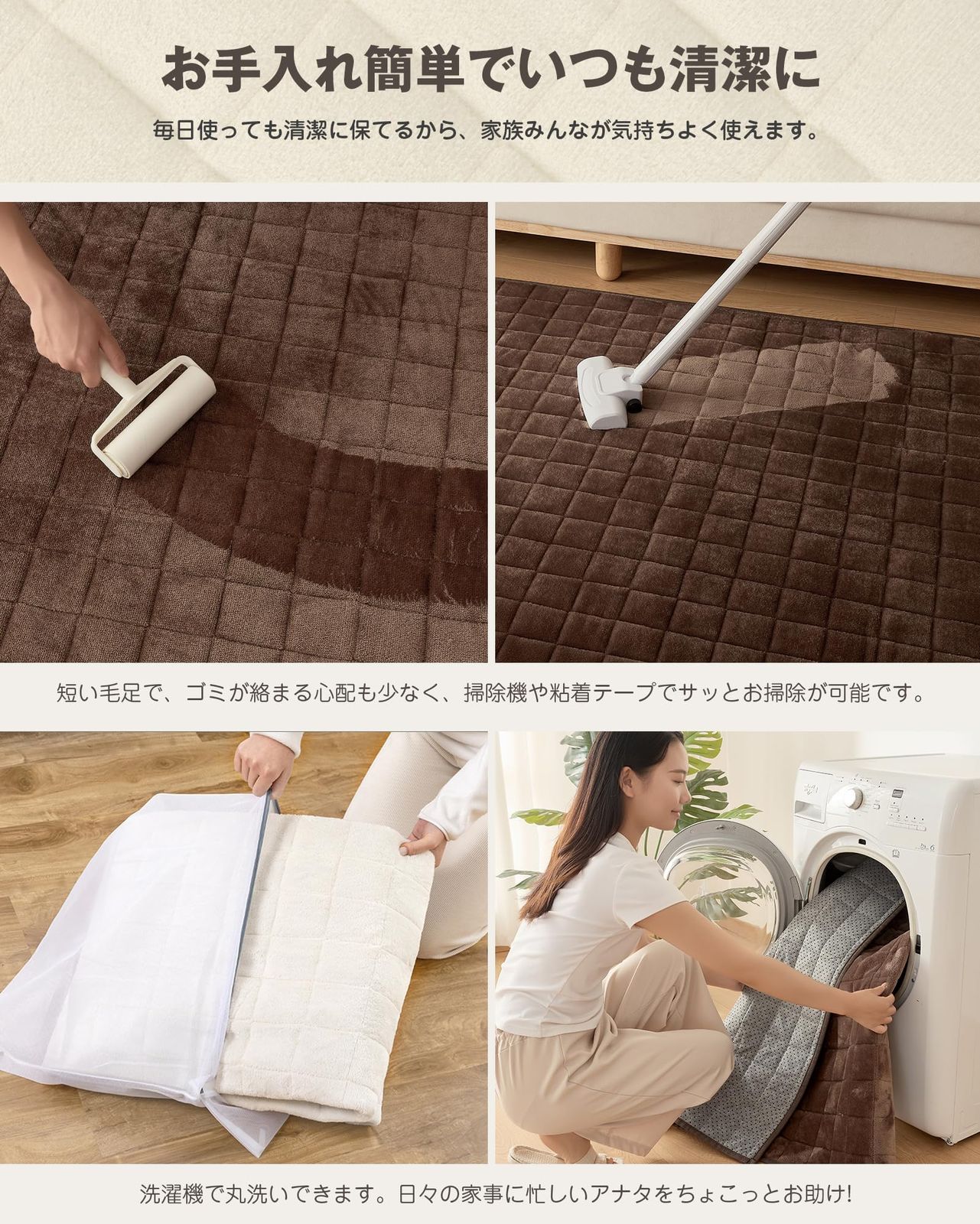 【掃除も楽々】毛足が短いのでゴミが絡まる心配も少なく、掃除機や粘着テープでサッとお掃除が可能です。ご家庭の洗濯機でまるっと洗えてお手入れ簡単です。フランネルキルトラグは軽く取り扱いが簡単、移動や収納も楽々です。