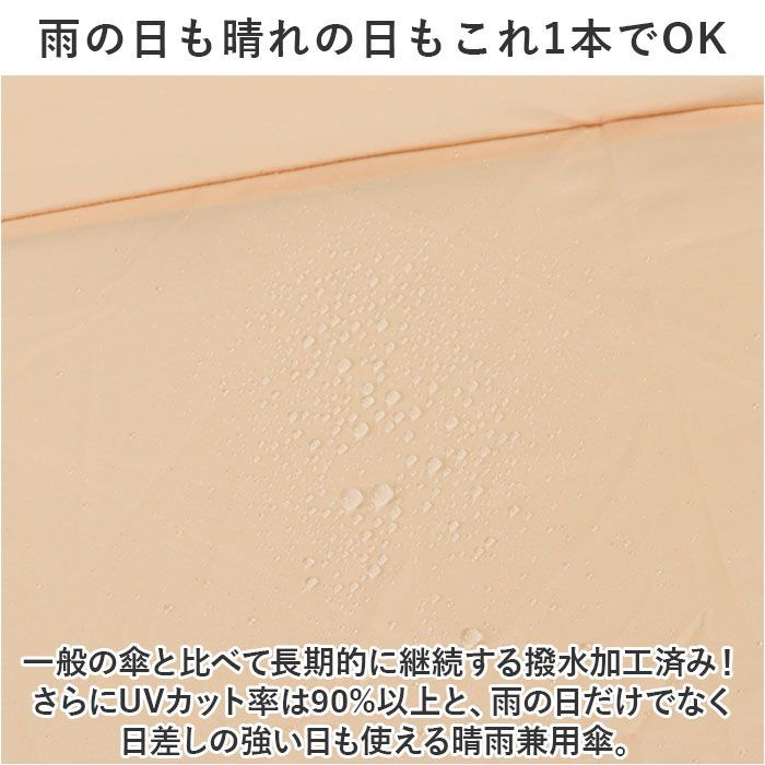 一般の傘と比べて長期的に継続する撥水加工済み!さらにUVカット率は90%以上と、雨の日だけでなく日差しの強い日も使える晴雨兼用傘。