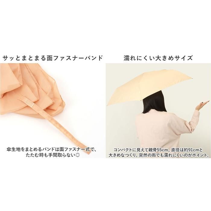 コンパクトに見えて親骨55cm、直径は約91cmと大きめなつくり。突然の雨でも濡れにくいのがポイント。