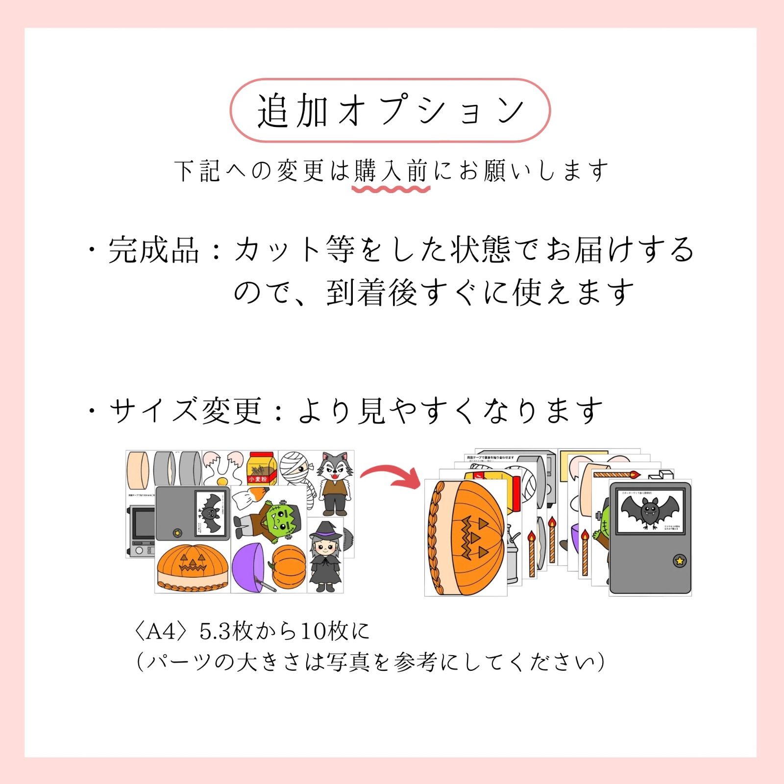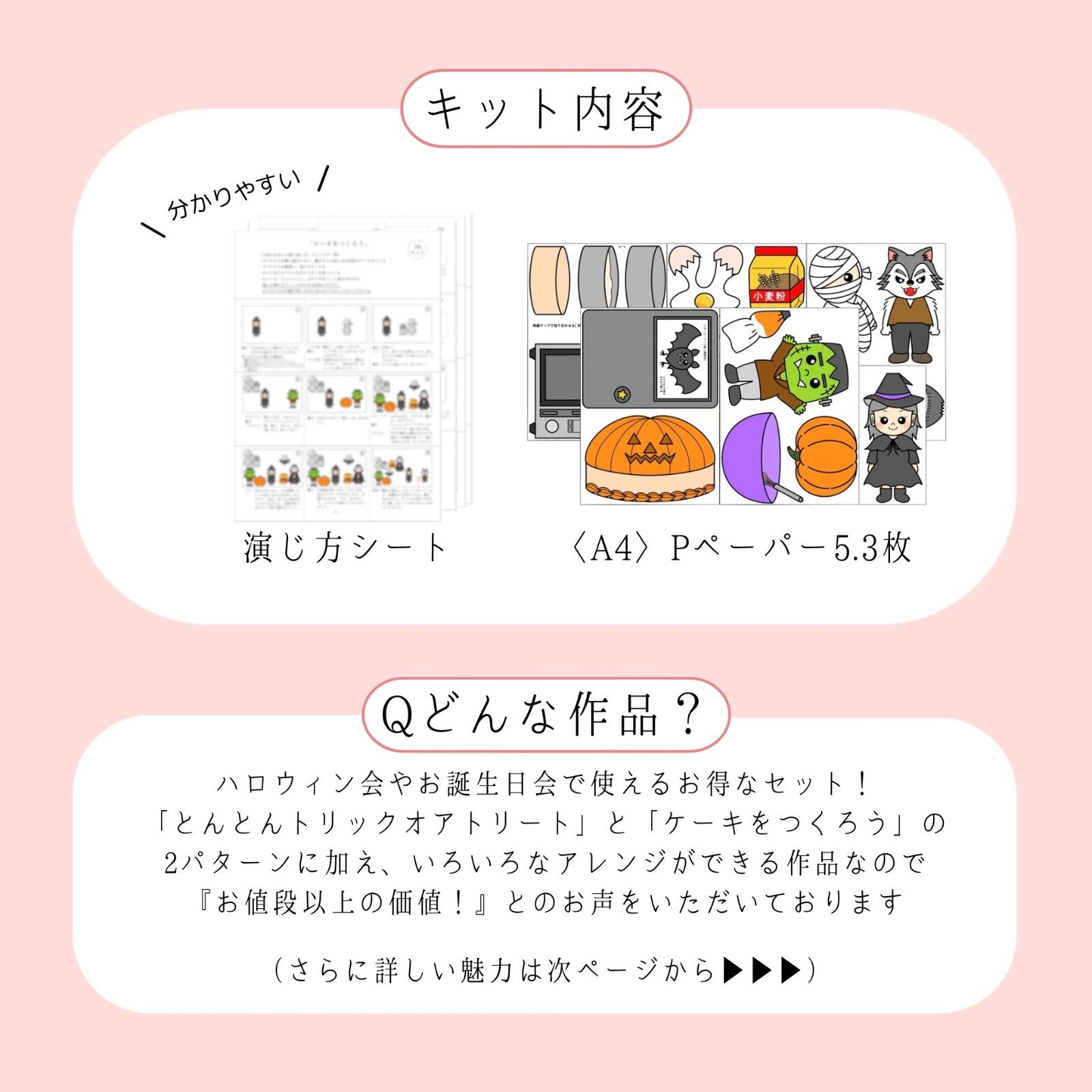 パネルシアター「ハロウィンセット」¥2900 ❯ ❯ ❯秋のお誕生日会にもぴったり! ⋰ ⋱⋰ ⋱⋰ ⋱⋰ ⋱⋰ ⋱⋰ ⋱ 「とんとんトリックオアトリート」と 「ケーキをつくろう」の 2つの台本付き! 色々なパターンで演じられて とてもお得なセットです! ⋱ ⋰ ⋱⋰ ⋱⋰ ⋱⋰ ⋱⋰ ⋱⋰ ┈作品内容┈ 〈素材〉A4サイズPペーパー 〈台本〉あり 〈状態〉未カット※お客様自身でカットと貼り合わせをお願いします 〈配送〉クリックポスト 〈あらすじ〉 オバケたちがドアからチラッと見えて登場する「とんとんトリックオアトリート」と、オバケたちが持ってきたユニークな食材でケーキをつくる「ケーキをつくろう」の2つのおはなしセットです。組み合わせて見応えたっぷりなおはなしにもできるので、ハロウィン行事や秋の誕生日会も安心です! ┈有料オプション┈ ▣ 完成品⇢+¥1000 ▣ サイズ変更⇢+¥2000 ▣ お急ぎ便⇢+¥700 ▣ 匿名配送⇢+¥100 ※Pペーパーではなく画用紙に印刷することも可能です【購入前に要相談】 (画用紙の場合は完成品はお受けできません) 【プロフィール必読】 #保育教材 #パネルシアター #ペープサート #スケッチブックシアター #マグネットシアター #部分実習 #手袋シアター #製作 #壁面 #ハロウィンシアター #秋のパネルシアター