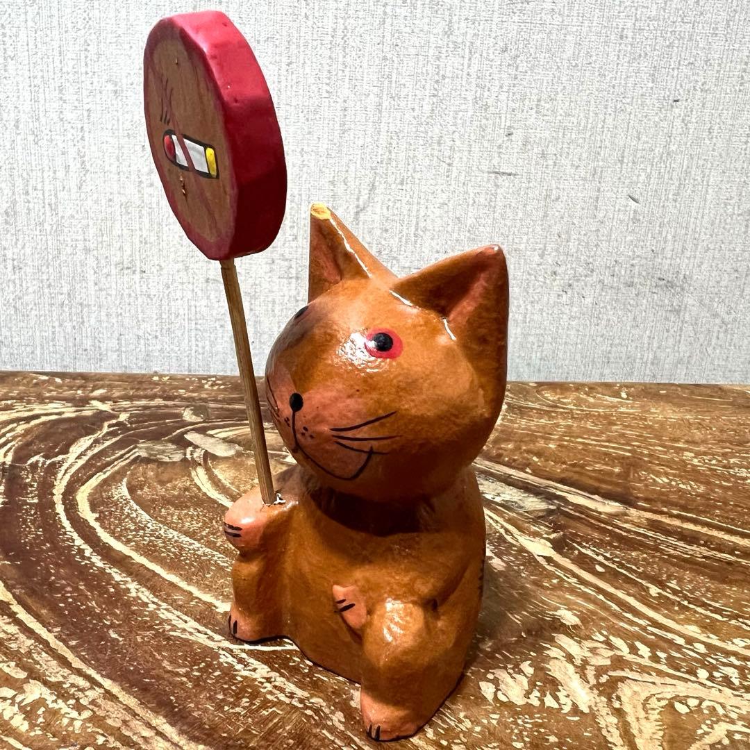 ノースモーキング桃猫さん 人形 猫の置物 木製 バリ雑貨 禁煙看板 喫煙看板