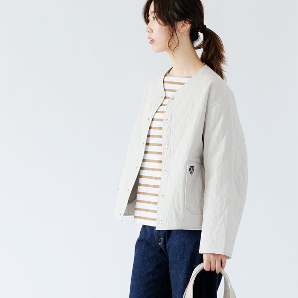 端正なダイヤキルトが施された、カーディガン感覚で着られるカラーレスジャケット。
