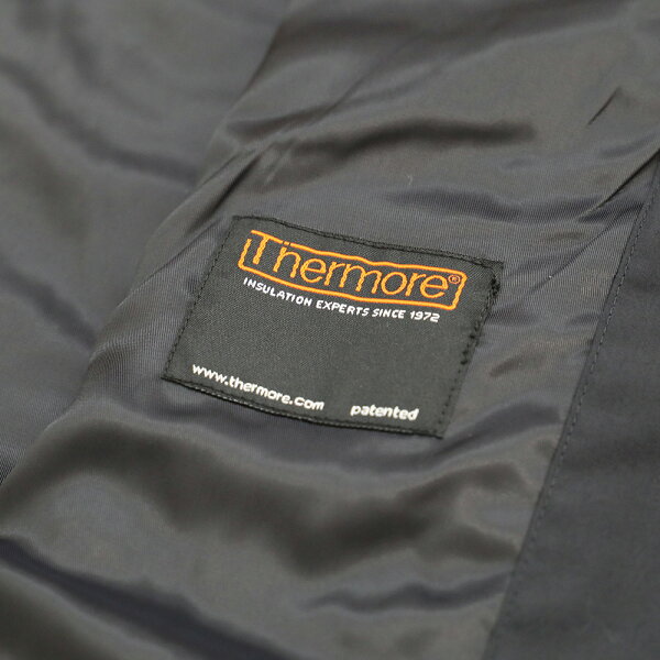 表地にはなめらかなタッチの高密度タイプライター生地を使用しています。中綿にはサーモア社の高機能中綿を使用。従来の中綿よりもソフトな質感と軽量で保温性に優れています。