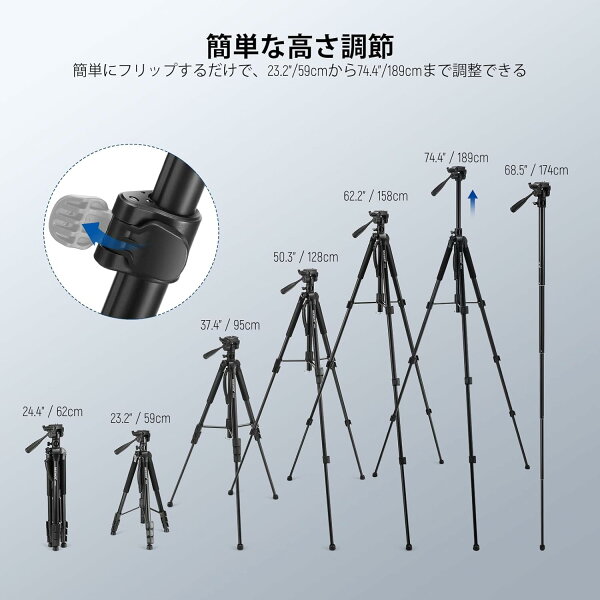 【柔軟で多用途なセンターコラム】●4段三脚は、23.6"/60cm~74.4"/189cmの高さ調節が可能で、多様な撮影シーンに柔軟に対応します。