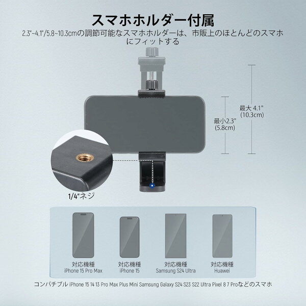 【スマホホルダー付属】●幅2.3"~4.1"/5.8~10.3cmのスマホホルダーはiPhone 16 15 14 13 Pro Max Plus Galaxy S24 S23 S22 Ultra Google Pixel 9 8 7 Proなどのスマホモデルに対応します。