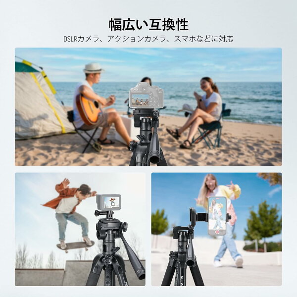 【リモート付き頑丈なカメラ三脚スタンド】●頑丈なビデオカメラ用三脚はアルミニウム合金製で、最大8kgまでのDSLRカメラ、アクションカメラ(アダプター別売)、スマホをしっかりと固定します。