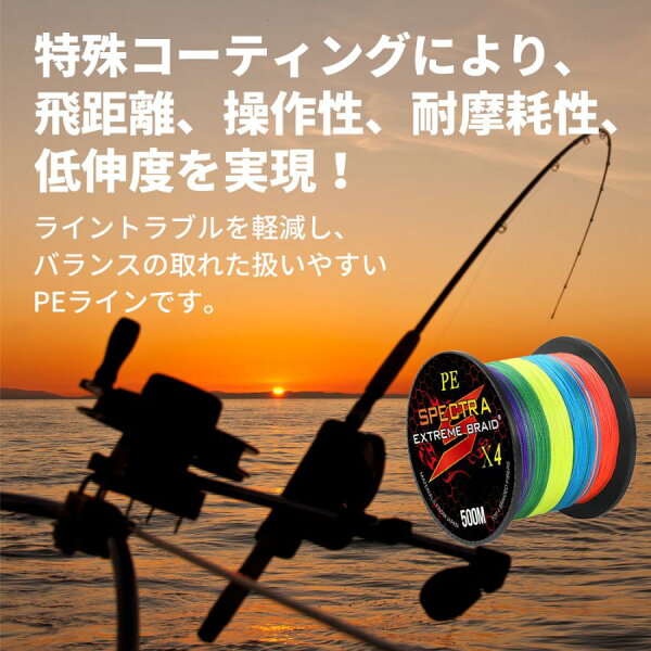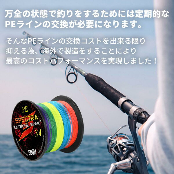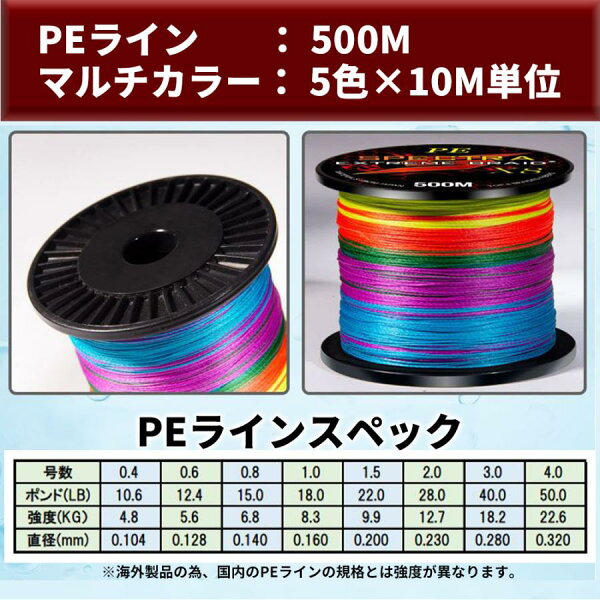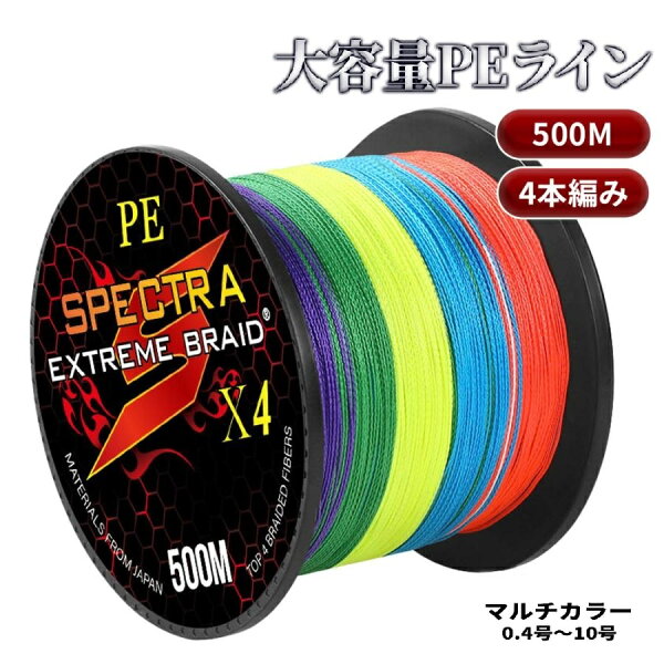 PEライン 500m 0.4号 0.6号 0.8号 1号 1.5号 2号 3号 4号 5号 6号 8号 10号 よつあみ 4本編み 釣り糸 大容量 5色マルチカラー シーバス バス ジギング エギング