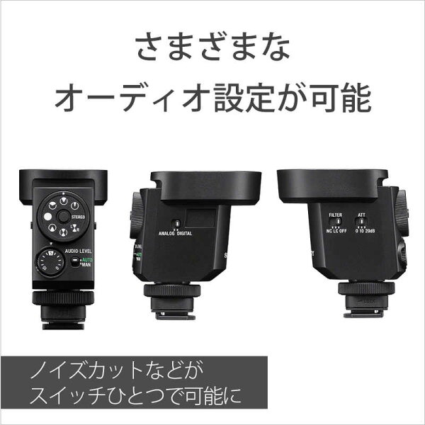 ●音声をデジタル伝送で劣化のない高音質録音を実現デジタルオーディオインターフェースに対応したマルチインターフェースシューを搭載したカメラ(*)と組み合わせることで、音声をデジタル信号のままダイレクトに伝送。劣化のない高音質録音を実現します。利用できる機能・8つの収音モードの切り換え・マイク内でのAD変換・ノイズカットフィルター・ローカットフィルター・アッテネータ