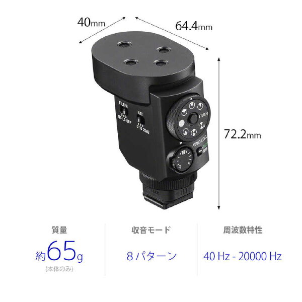 仕様3:チャンネル音声出力:アナログ 2ch / デジタル 4chシュー形状:マルチインターフェースシュー形式:バックエレクトレットコンデンサー型周波数特性:40Hz - 20000Hz
