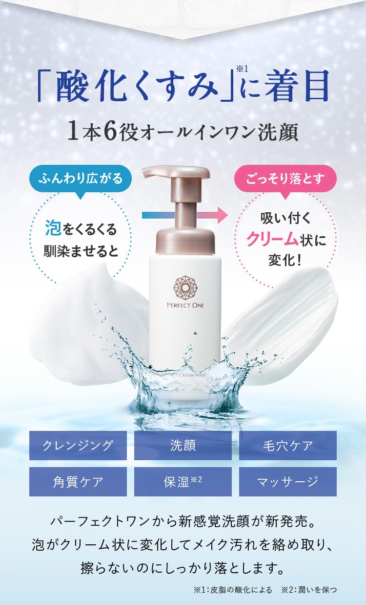 | 商品の利点: | 「ふわふわの泡がメイク汚れ・余分な皮脂を溶かす」、「泡からクリーム状に剤形変化!毛穴の酸化くすみをごっそり絡めとる」、「ひとつで6役(メイク落とし、洗顔、マッサージ、保湿、角質ケア、毛穴ケア)」 |