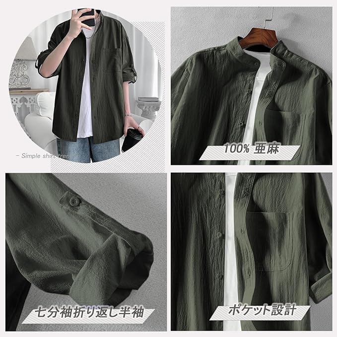 | トップスタイル: | カジュアルなボタンアップシャツ、バンドカラー、ルーズフィット、調整可能な袖長 |