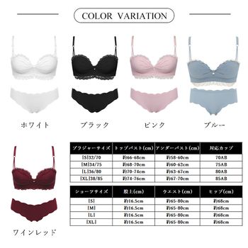 -------------------- こちらの商品は 沖縄・離島への配送ができません。 -------------------- -------------------- 10時ごろまでの受付で即日発送 *土日祝日は発送業務を行っておりません *受付時間は10時から17時となっております -------------------- レース付きでリボンのデザインが印象的なノンワイヤーブラ&ショーツセット 伸縮性抜群のストラップは取り外し可能なので、ファッションに合わせることができます ノンワイヤーなのにしっかり谷間! 小胸さんも盛れる ブラジャー素材:ナイロン85%+ポリウレタン15%ショーツ素材:ナイロン85%+ポリウレタン15%クロッチ:綿100% カラー:ブラック/ホワイト/ピンク/ブルー/ワインレッド ・サイズ ブラジャー: [S]32/70 70AB トップバスト:約66-68cm アンダーバスト:約58-60cm [M]34/75 75AB トップバスト:約68-70cm アンダーバスト:約60-62cm [L]36/80 80AB トップバスト:約70-74cm アンダーバスト:約63-67cm [XL]38/85 85AB トップバスト:約74-76cm アンダーバスト:約67-70cm ショーツ: [S]股上:約16.5cm ウエスト:約65-80cm ヒップ:約68cm [M]股上:約16.5cm ウエスト:約65-80cm ヒップ:約68cm [L]股上:約16.5cm ウエスト:約65-80cm ヒップ:約68cm [XL]股上:約16.5cm ウエスト:約65-80cm ヒップ:約68cm ・仕様 3/4カップ、ホック3列4段階調節、肩紐取外し可、ワイヤー:なし ・効果 谷間づくり、ボリュームUP 補正機能:あり ワイヤー:なし カップ:あり 裏地:なし 伸縮性:あり 透け感:なし 生産国:中国 ※すべて平置きサイズです(採寸方法違いより、多少の誤差がございますので、ご了承ください)。 ※海外輸入品のため、商品の細部仕様は予告なく変更になる場合がございます。 予めご了承の上、ご注文お願い致します。 -------------------- こちらの商品は メール便での発送となります --------------------
