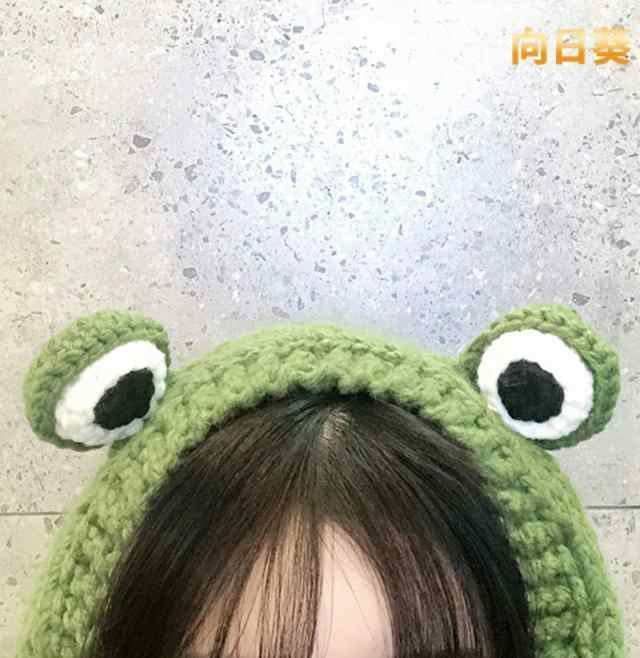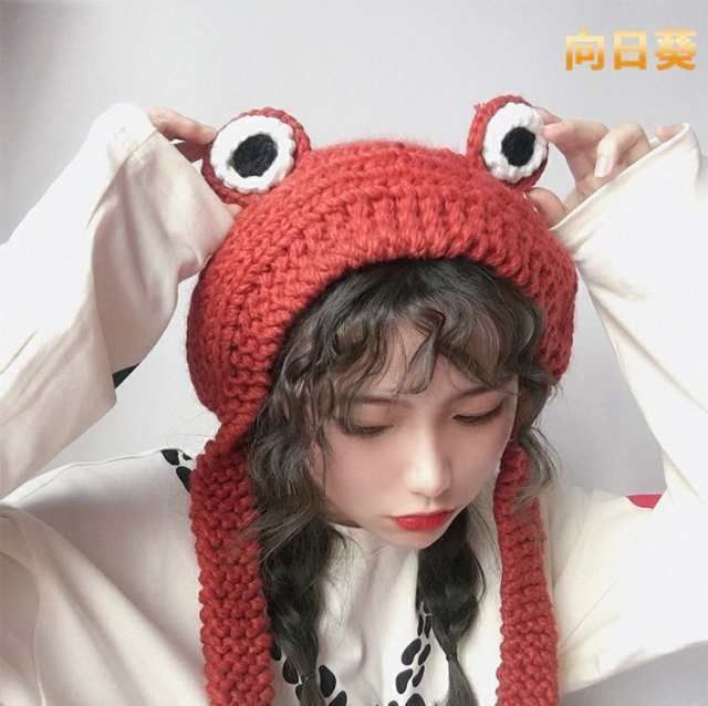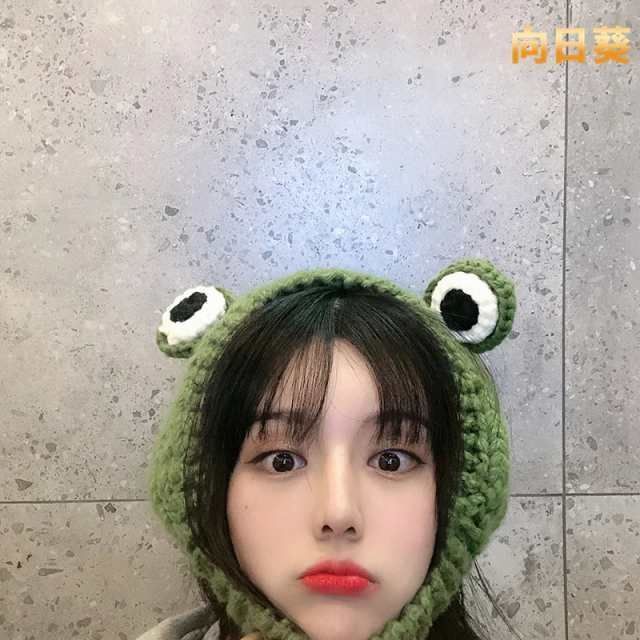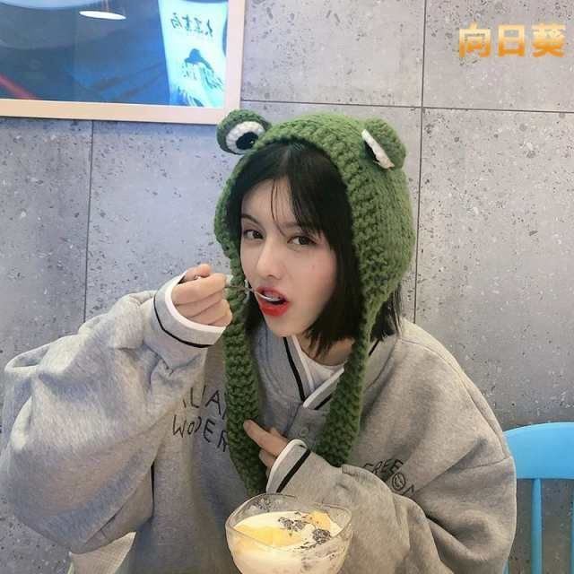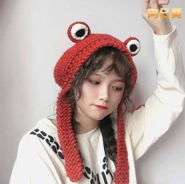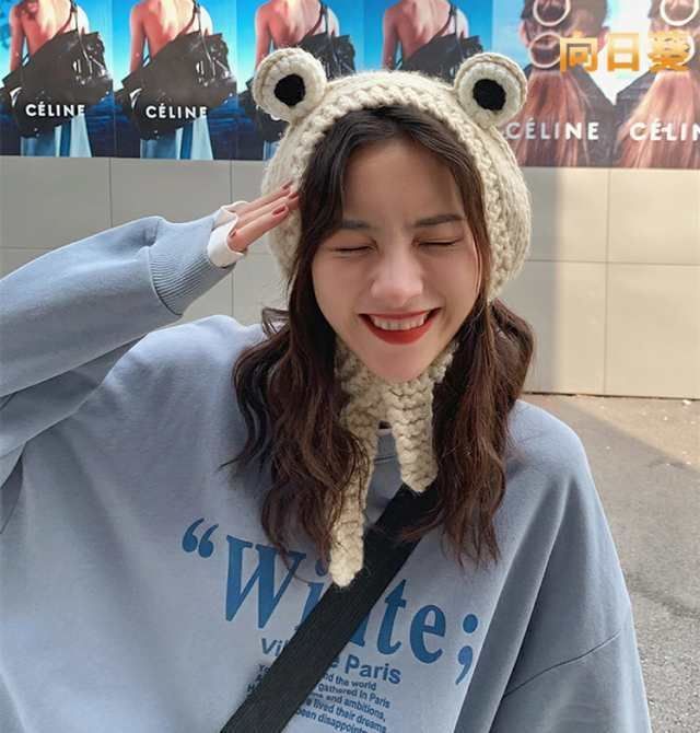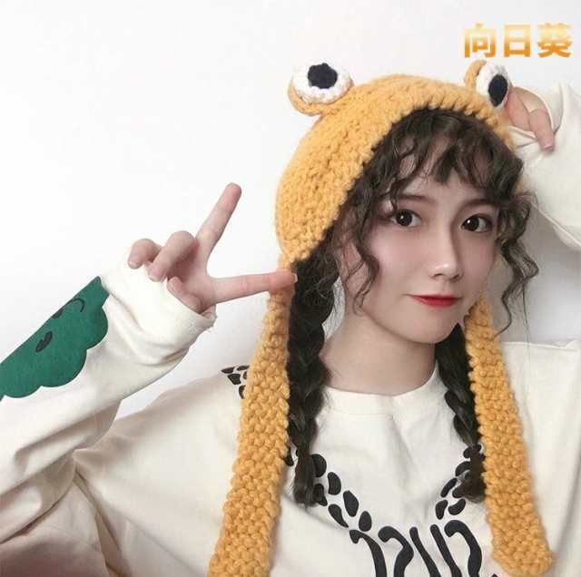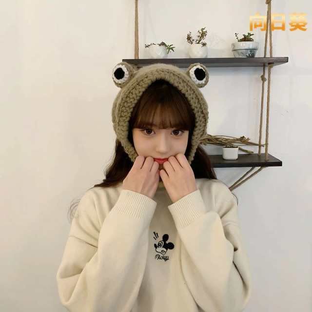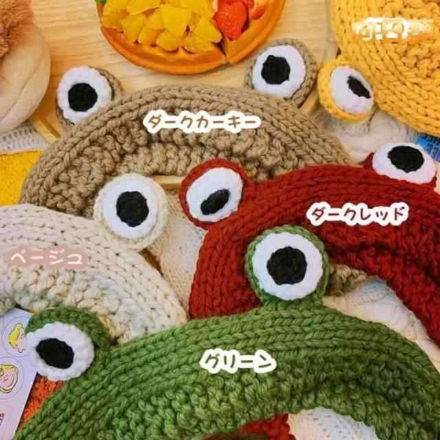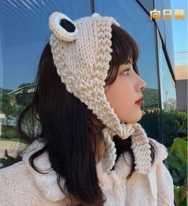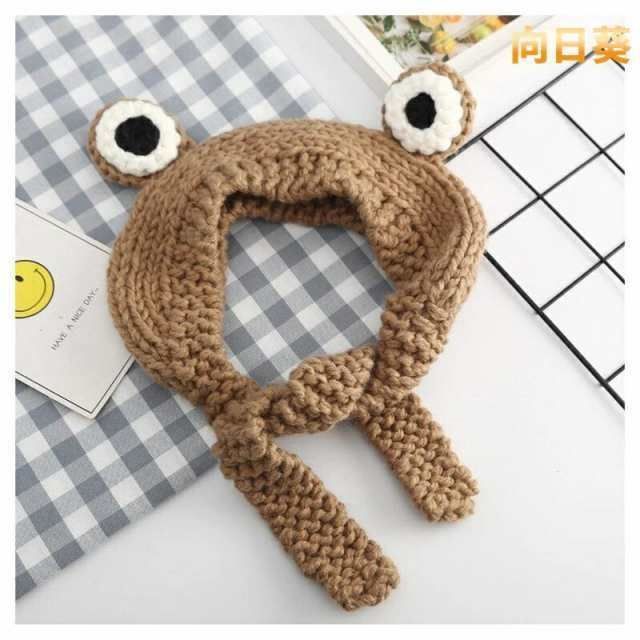 2点セット ヘアバンド型 ニット帽子 耳あて付き 耳付き キャップ レディース 女の子 男の子 秋冬用 防寒 ジュニア かわいい カエル 蛙