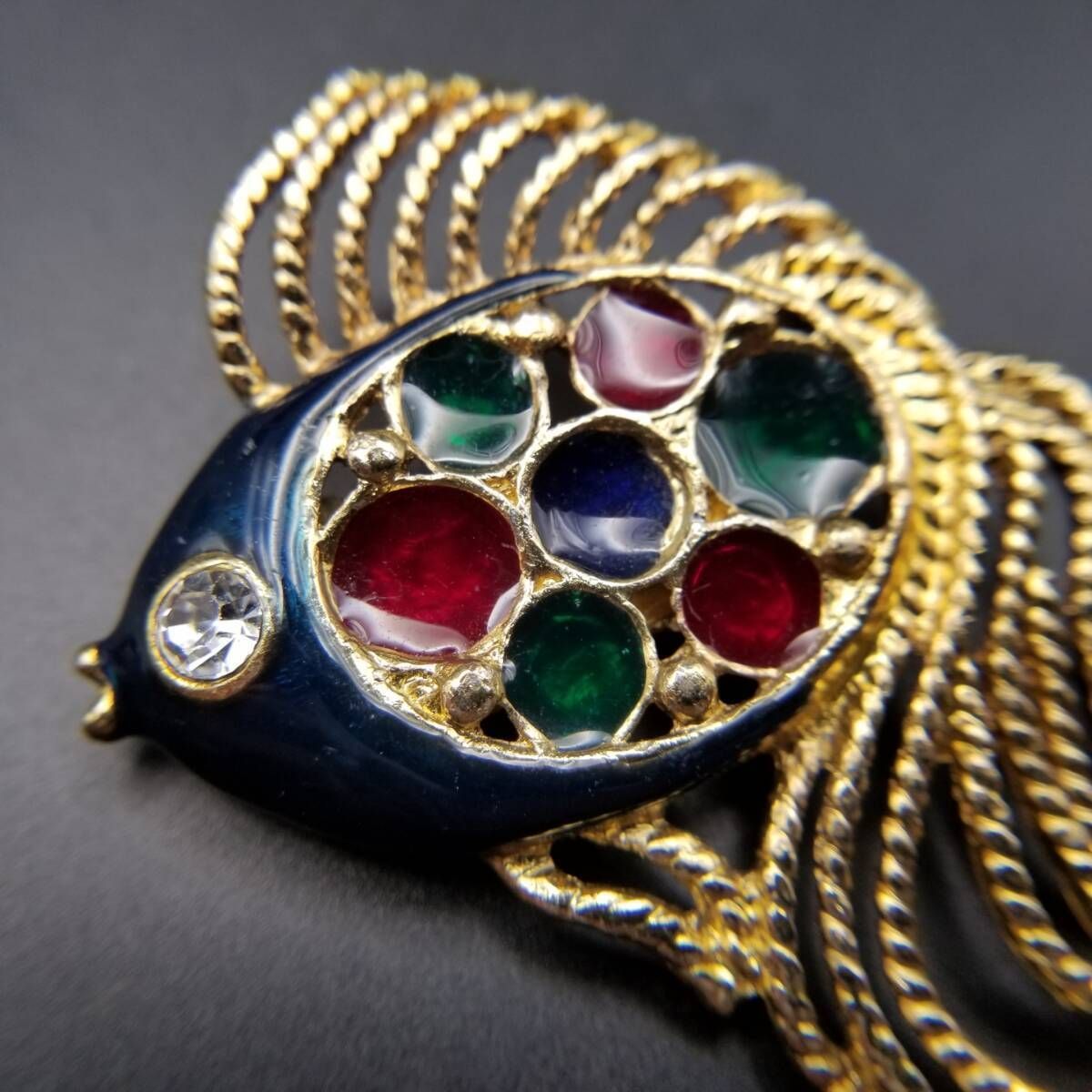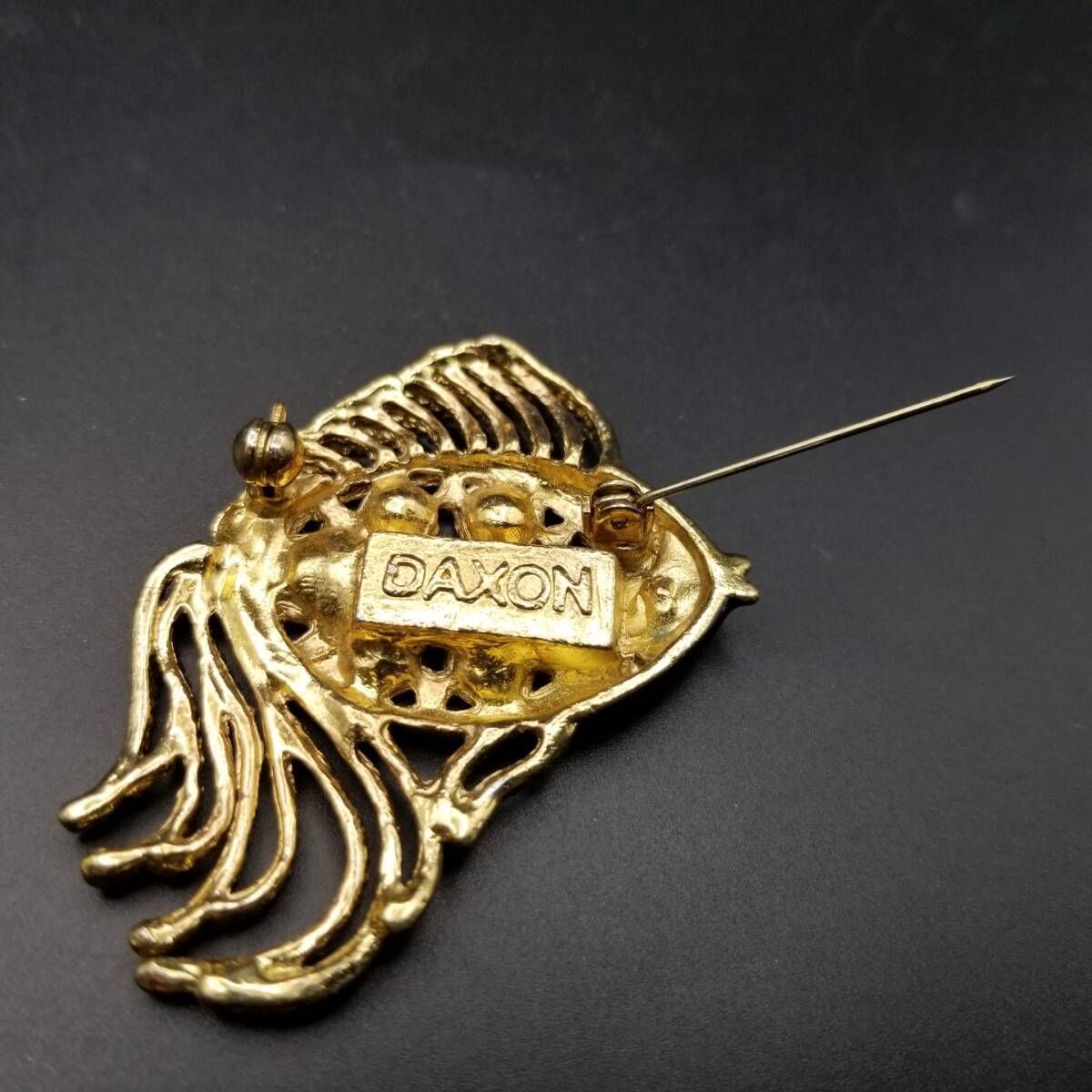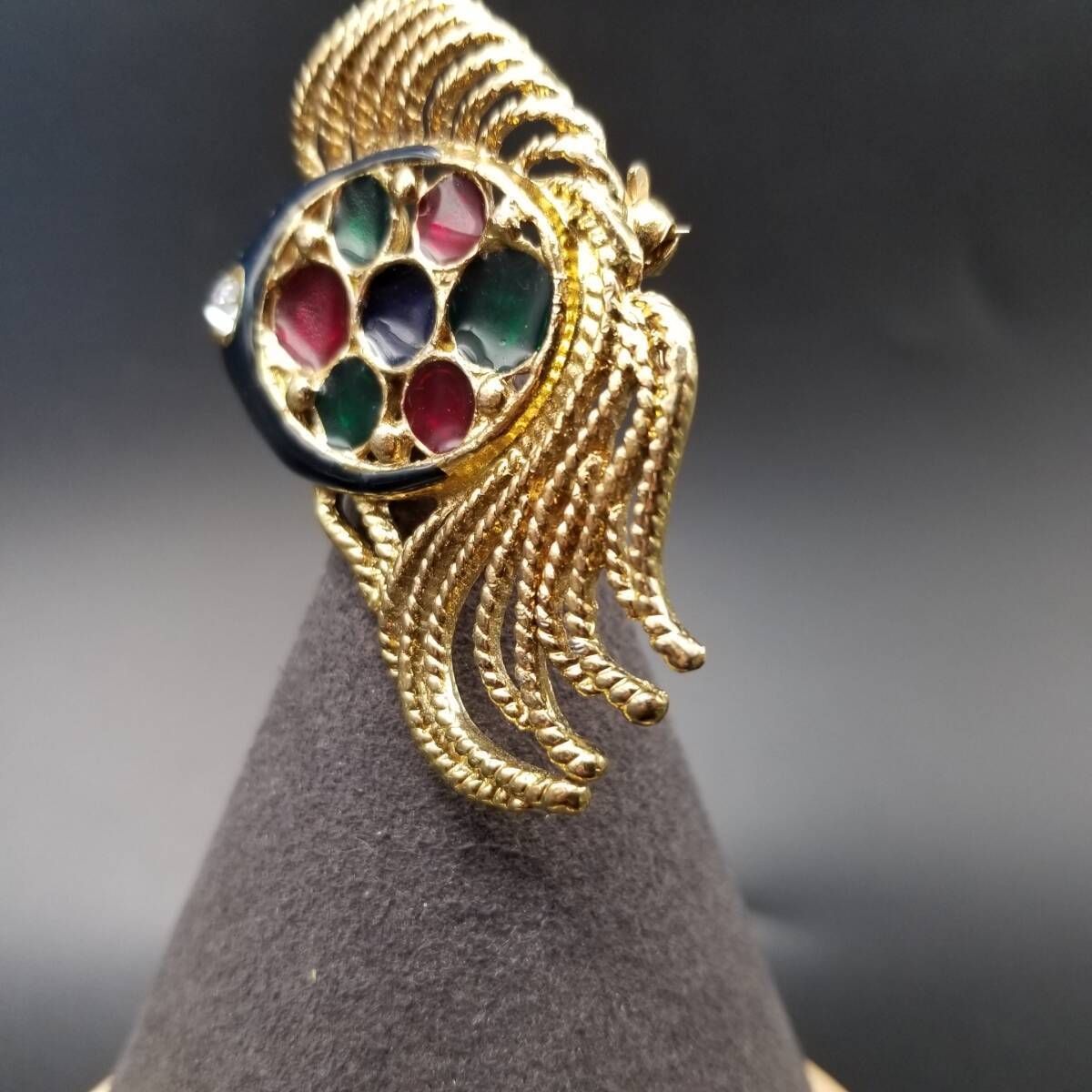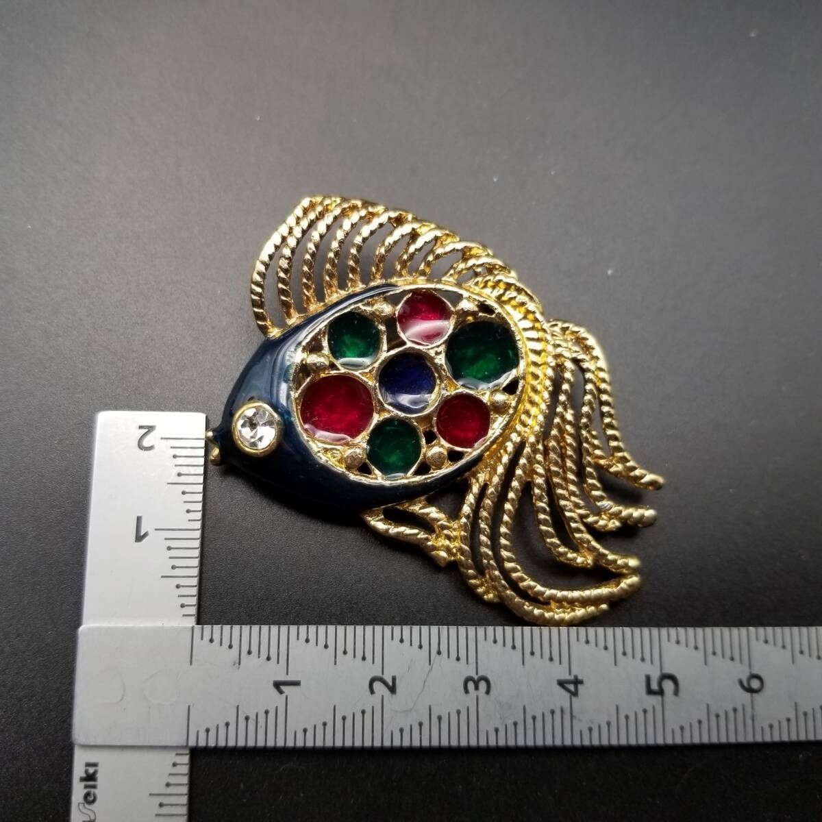 80's DAXON 英国 ヴィンテージ 尾の長い魚 マルチカラー ガラス インレイ ヴィンテージ フィッシュ ブローチ 大ぶり 存在感 Y22-O