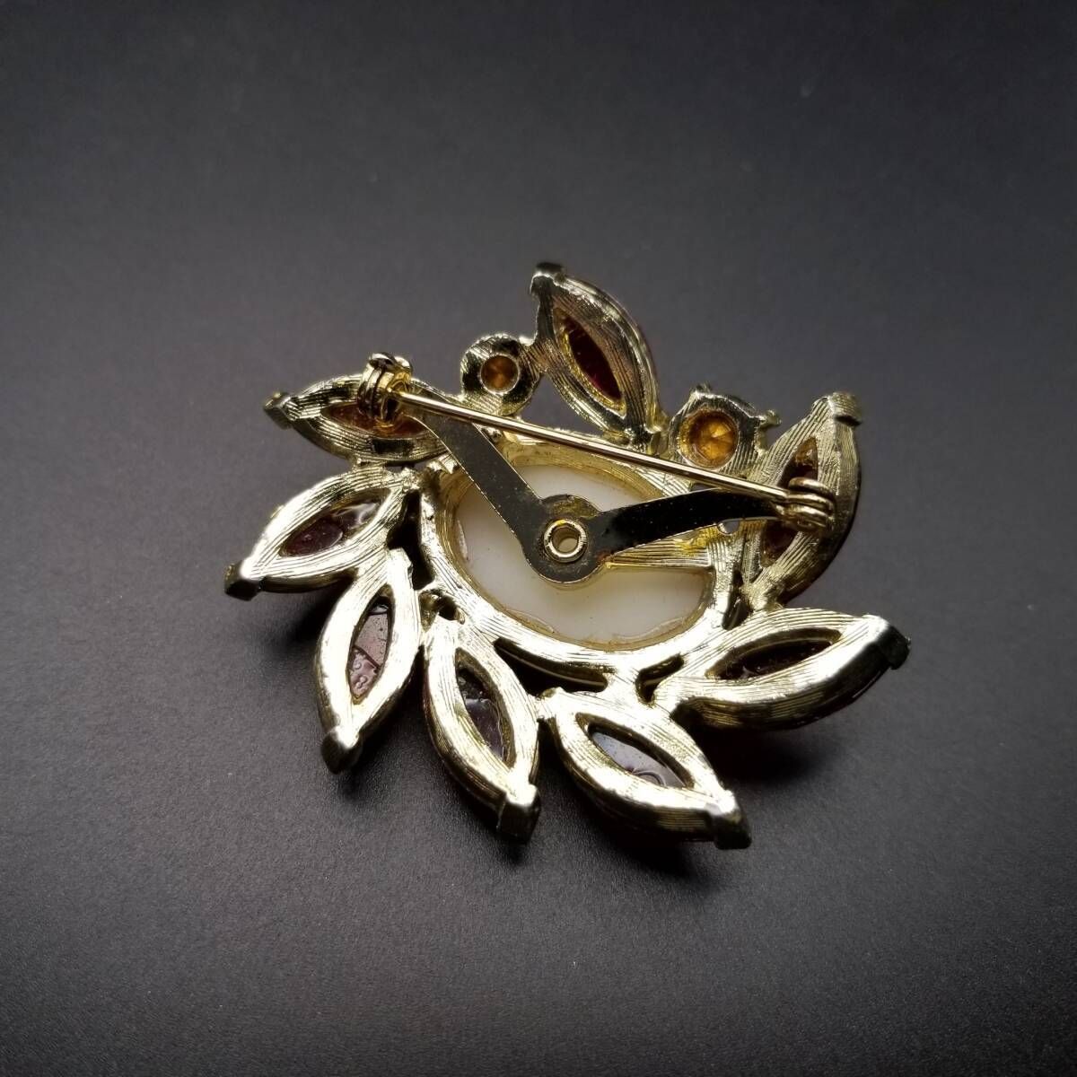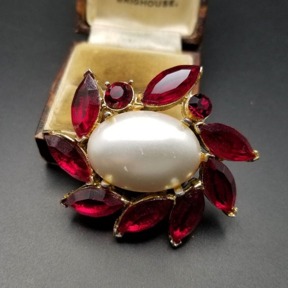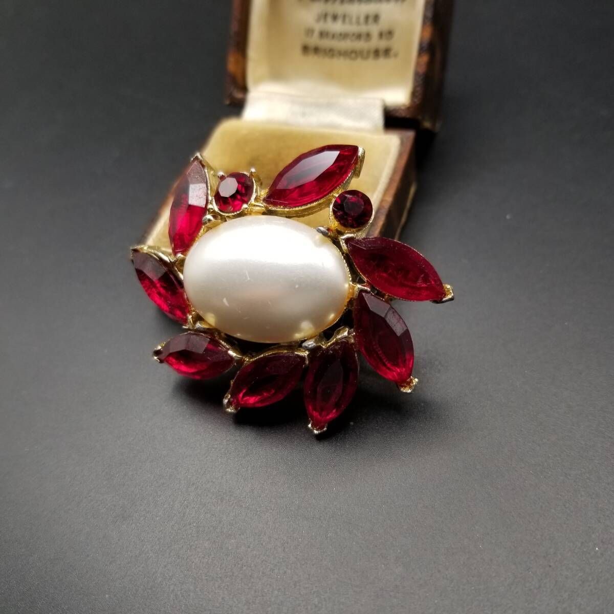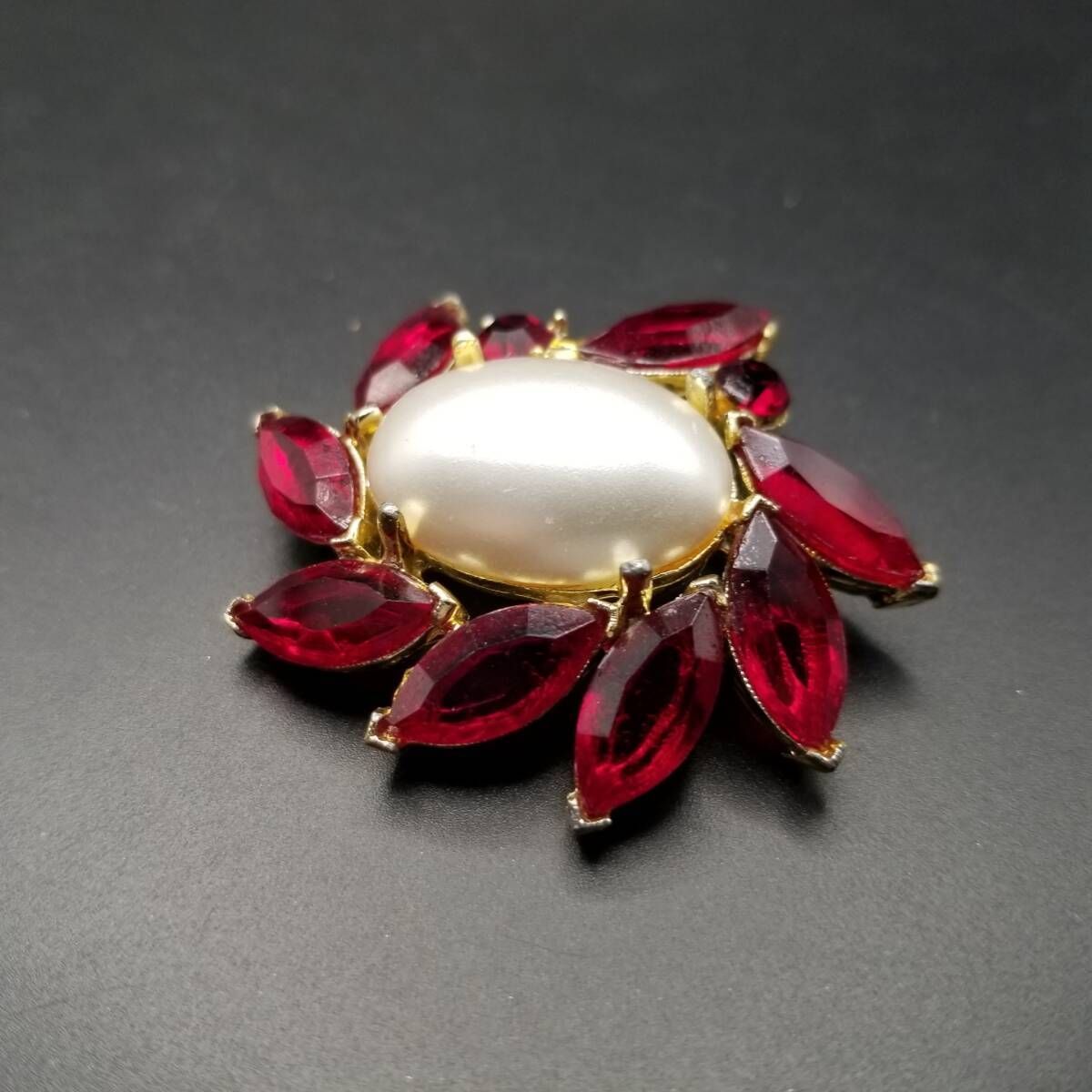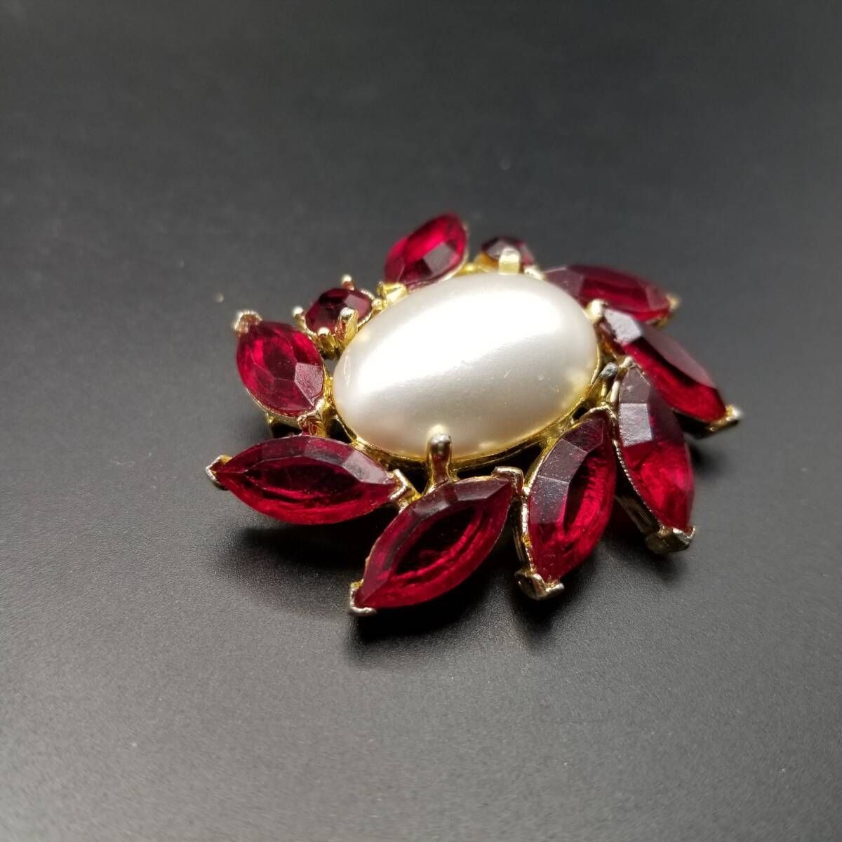 50's 赤い花 パール調 カボション ヴィンテージ フラワー ブローチ マーキスカット レッドストーン エレガント 存在感 Y22-H