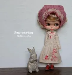 ブライス アウトフィット アヒル 赤糸刺繍 紅茶染めのワンピース つけ襟 セット