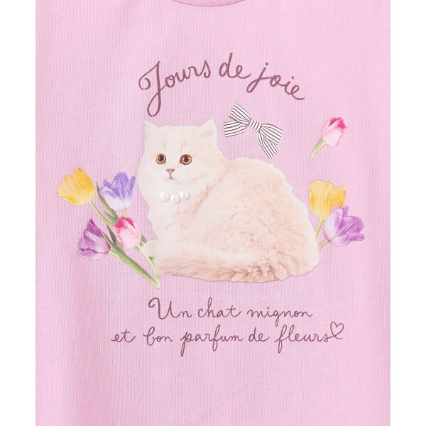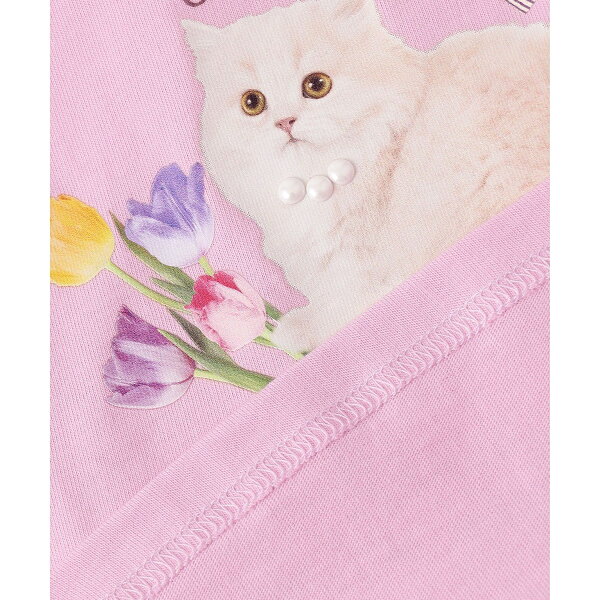 ネコちゃんのフォトプリントがかわいい、半袖Tシャツ。首輪の部分はパールのようなモチーフ付きです。水彩タッチのカラフルなお花のプリントもついていて、華やかな一枚。綿100%なので、お子様にも安心して着用して頂けます。