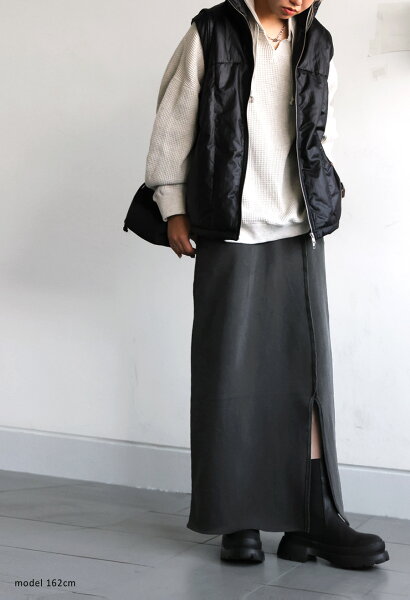 スウェットスカートならではのラフな快適さと、大人カジュアルに映える表情豊かな加工感が魅力の一着です。