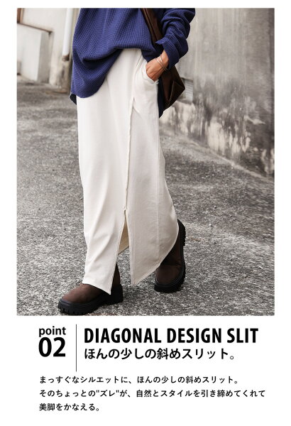 フロントには斜めスリットが入り、動きやすさと抜け感を両立したリラックスデザイン。