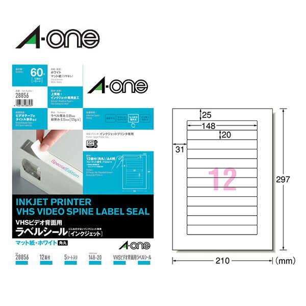 【A4・12面・角丸】エーワン/インクジェットプリンタ対応ラベル(28856)四辺余白付・VHSビデオ背面用 5シート・60片 乾きが早く、色鮮やか!写真も文字もキレイに印刷/A-one